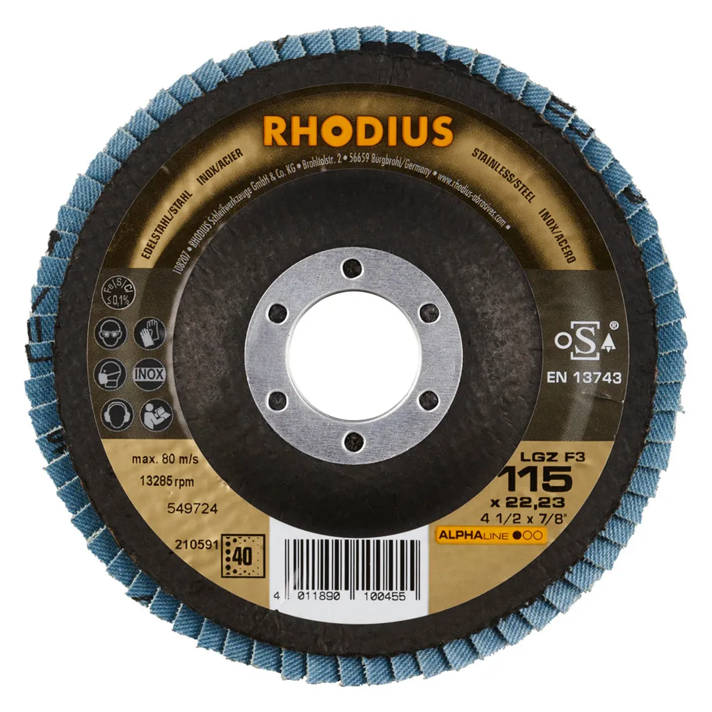 Ce disque a été conçu conformément à la norme EN 13743, satisfait aux exigences de sécurité et est homologué par l’oSA. Il est doté d’un plateau support en fibres de verre. Son utilisateur peut travailler en exerçant de fortes pressions sur sa machine. Le LGZ F3 utilise du zirconium de qualité comme grain abrasif. Tous les disques à lamelles RHODIUS ne contiennent en outre ni fer, ni soufre. Les lamelles de ce disque sont plates. Lorsqu’un meulage plan est requis, cet agencement plat des lamelles facilite tout particulièrement le travail.
