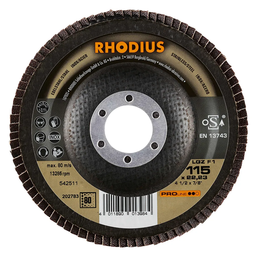 Ce disque a été conçu conformément à la norme EN 13743, satisfait aux exigences de sécurité et est homologué par l’oSA. Il est doté d’un plateau support en fibres de verre. Son utilisateur peut travailler en exerçant de fortes pressions sur sa machine. Le LGZ F1 utilise du zirconium de qualité comme grain abrasif. Tous les disques à lamelles RHODIUS ne contiennent en outre ni fer, ni soufre. Les lamelles de ce disque sont plates. Lorsqu’un meulage plan est requis, cet agencement plat des lamelles facilite tout particulièrement le travail.