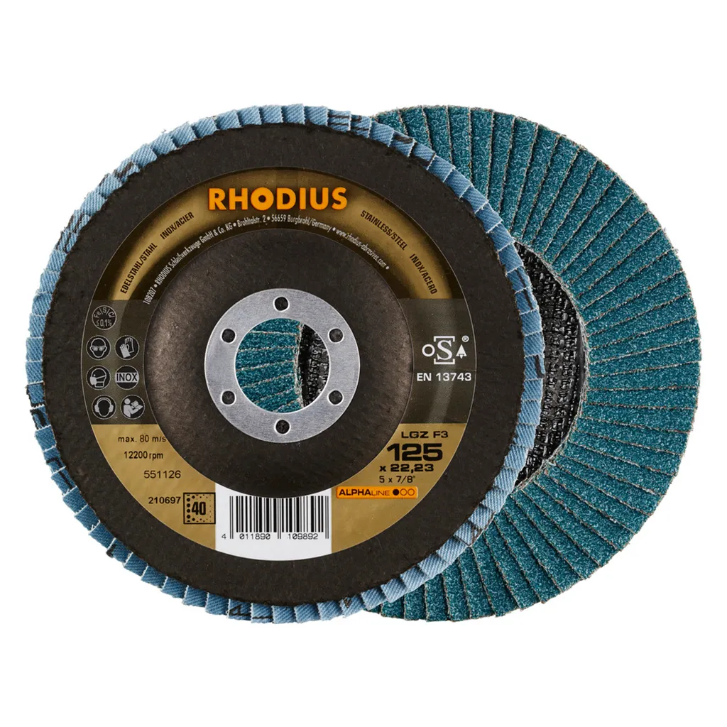 Ce disque a été conçu conformément à la norme EN 13743, satisfait aux exigences de sécurité et est homologué par l’oSA. Il est doté d’un plateau support en fibres de verre. Son utilisateur peut travailler en exerçant de fortes pressions sur sa machine. Le LGZ F3 utilise du zirconium de qualité comme grain abrasif. Tous les disques à lamelles RHODIUS ne contiennent en outre ni fer, ni soufre. Les lamelles de ce disque sont plates. Lorsqu’un meulage plan est requis, cet agencement plat des lamelles facilite tout particulièrement le travail.