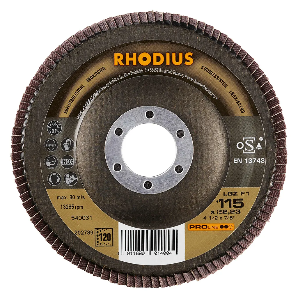 Ce disque a été conçu conformément à la norme EN 13743, satisfait aux exigences de sécurité et est homologué par l’oSA. Il est doté d’un plateau support en fibres de verre. Son utilisateur peut travailler en exerçant de fortes pressions sur sa machine. Le LGZ F1 utilise du zirconium de qualité comme grain abrasif. Tous les disques à lamelles RHODIUS ne contiennent en outre ni fer, ni soufre. Les lamelles de ce disque sont plates. Lorsqu’un meulage plan est requis, cet agencement plat des lamelles facilite tout particulièrement le travail.