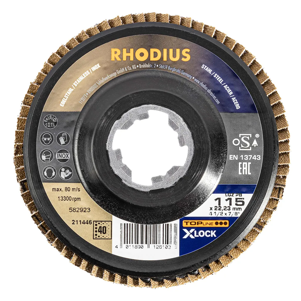 Ce disque a été conçu de manière à satisfaire aux exigences de sécurité de la norme EN 13743 et est homologué par l’oSA. Le plateau support est fabriqué en polyamide, permettant un meulage très délicat. Le LGZ PB X-LOCK utilise du zirconium de qualité comme grain abrasif. Tous les disques à lamelles RHODIUS ne contiennent en outre ni fer, ni soufre. Les lamelles de ce disque sont plates. Lorsqu’un meulage plan est requis, cet agencement plat des lamelles facilite tout particulièrement le travail.
