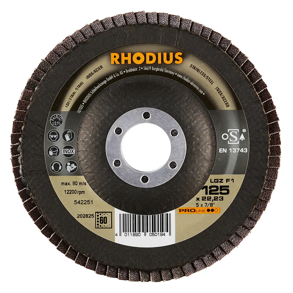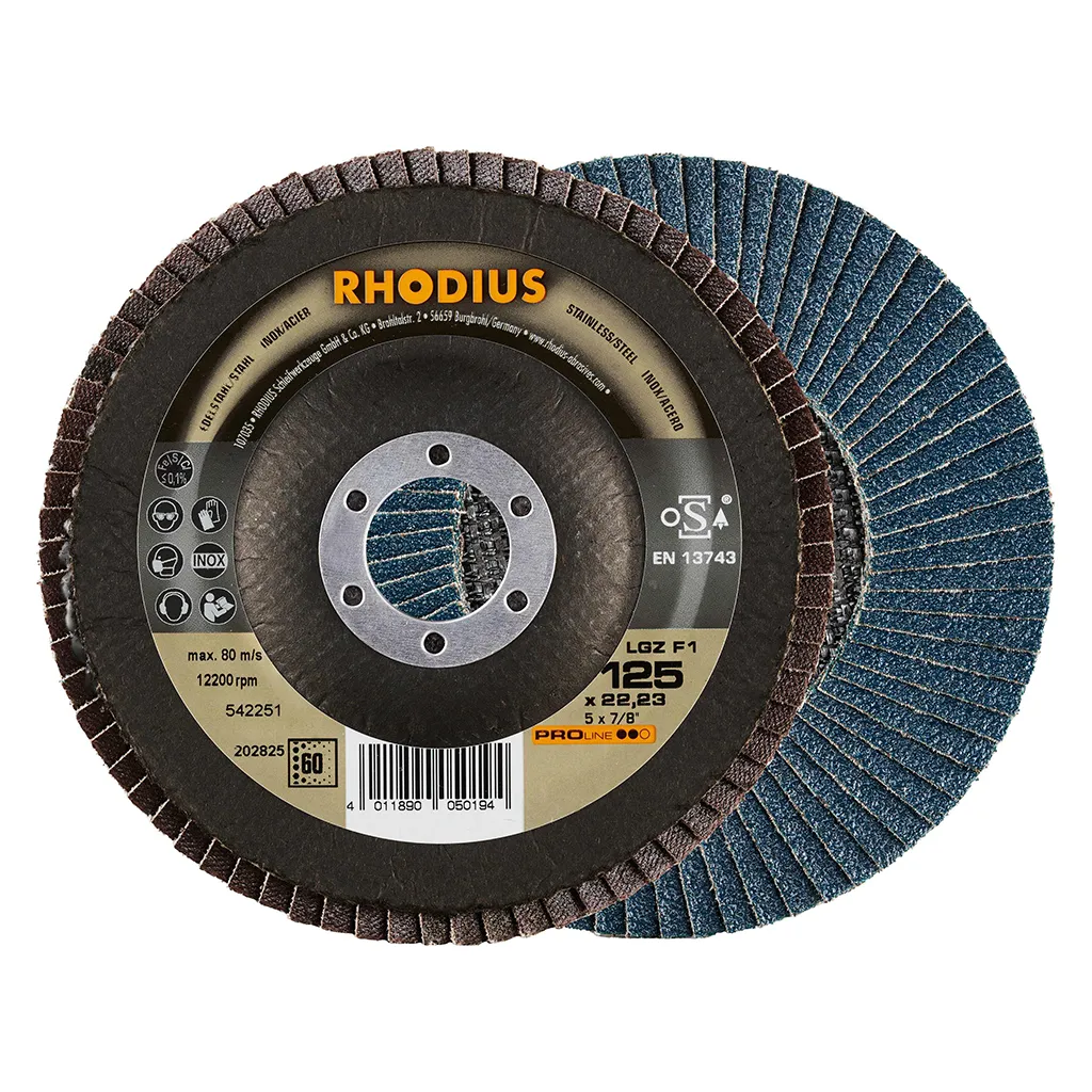 Ce disque a été conçu conformément à la norme EN 13743, satisfait aux exigences de sécurité et est homologué par l’oSA. Il est doté d’un plateau support en fibres de verre. Son utilisateur peut travailler en exerçant de fortes pressions sur sa machine. Le LGZ F1 utilise du zirconium de qualité comme grain abrasif. Tous les disques à lamelles RHODIUS ne contiennent en outre ni fer, ni soufre. Les lamelles de ce disque sont plates. Lorsqu’un meulage plan est requis, cet agencement plat des lamelles facilite tout particulièrement le travail.