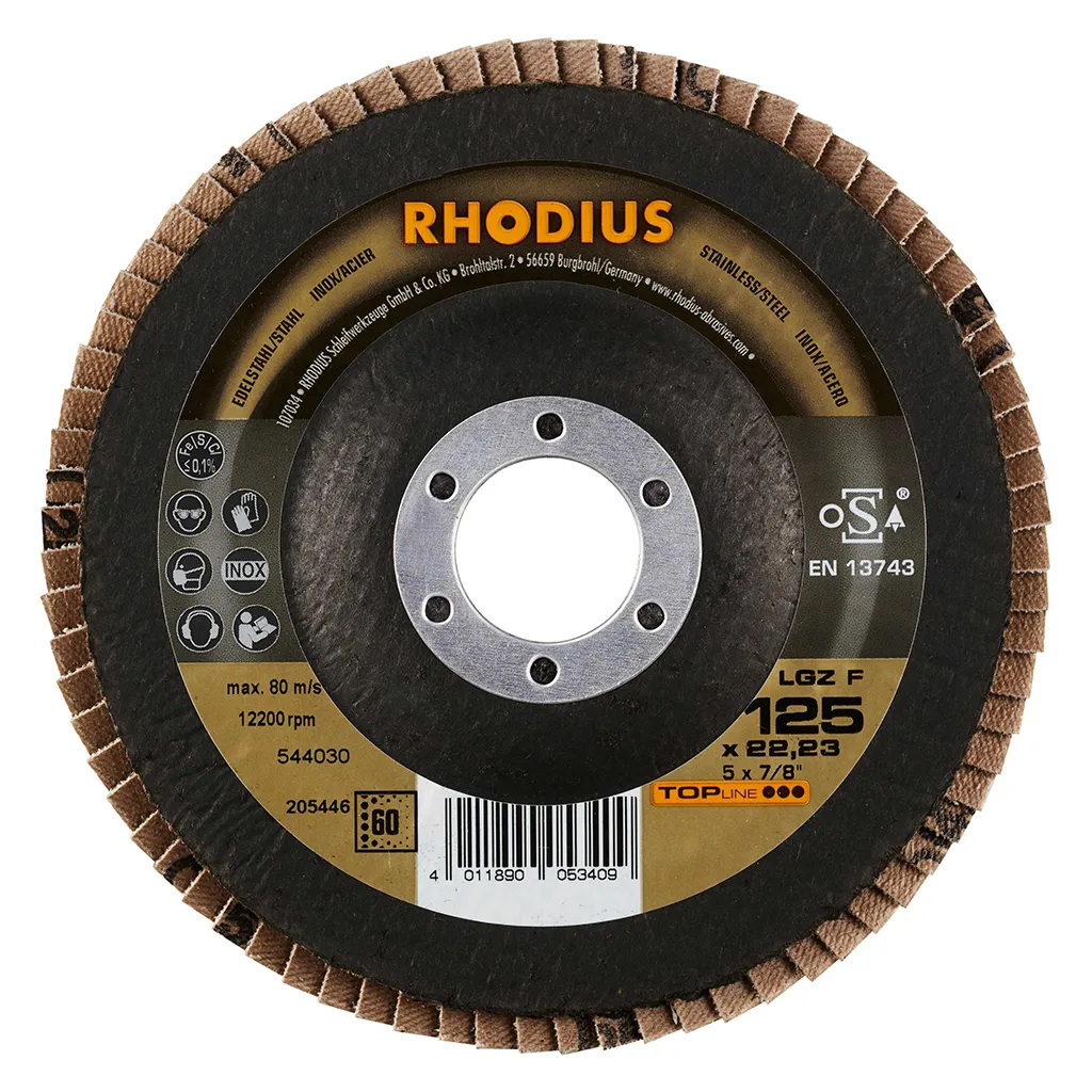Ce disque a été conçu conformément à la norme EN 13743, satisfait aux exigences de sécurité et est homologué par l’oSA. Il est doté d’un plateau support en fibres de verre. Son utilisateur peut travailler en exerçant de fortes pressions sur sa machine. Le LGZ F utilise du zirconium de qualité comme grain abrasif. Tous les disques à lamelles RHODIUS ne contiennent en outre ni fer, ni soufre. Les lamelles de ce disque sont plates. Lorsqu’un meulage plan est requis, cet agencement plat des lamelles facilite tout particulièrement le travail.