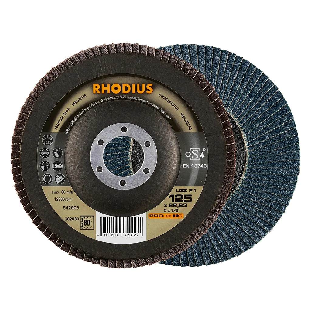 Ce disque a été conçu conformément à la norme EN 13743, satisfait aux exigences de sécurité et est homologué par l’oSA. Il est doté d’un plateau support en fibres de verre. Son utilisateur peut travailler en exerçant de fortes pressions sur sa machine. Le LGZ F1 utilise du zirconium de qualité comme grain abrasif. Tous les disques à lamelles RHODIUS ne contiennent en outre ni fer, ni soufre. Les lamelles de ce disque sont plates. Lorsqu’un meulage plan est requis, cet agencement plat des lamelles facilite tout particulièrement le travail.