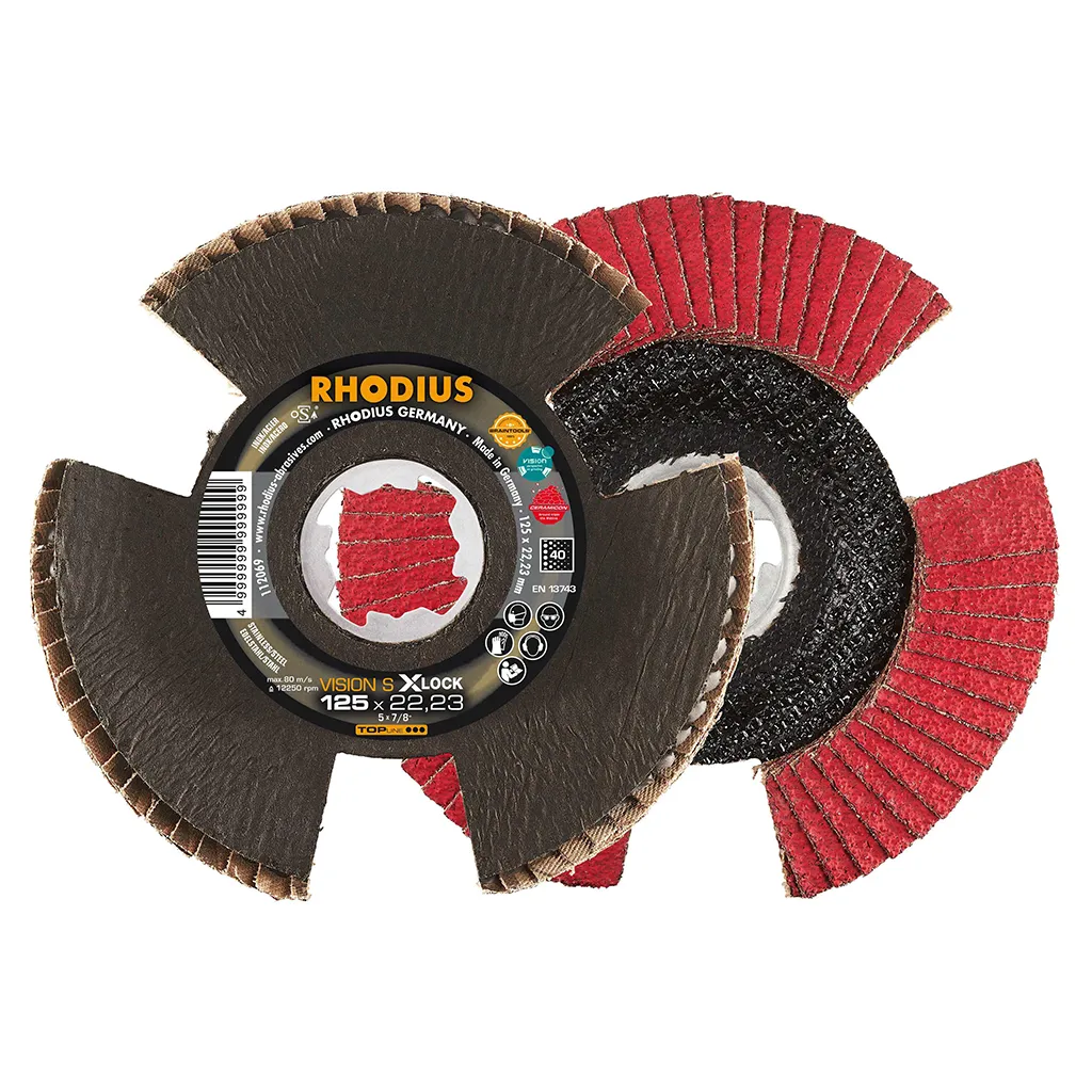 Ce disque a été conçu conformément à la norme EN 13743, satisfait aux exigences de sécurité et est homologué par l’oSA. Il est doté d’un plateau support en fibres de verre. Son utilisateur peut travailler en exerçant de fortes pressions sur sa machine. Le VISION SPEED X-LOCK utilise un grain céramique de qualité (corindon fritté) comme grain abrasif. Celui-ci est auto-affûtant. Tous les disques à lamelles RHODIUS ne contiennent en outre ni fer, ni soufre. Les lamelles sont placées de manière conique sur ce disque. Le positionnement conique des lamelles à 12° améliore l’ergonomie pendant le meulage et facilite ainsi la manipulation.