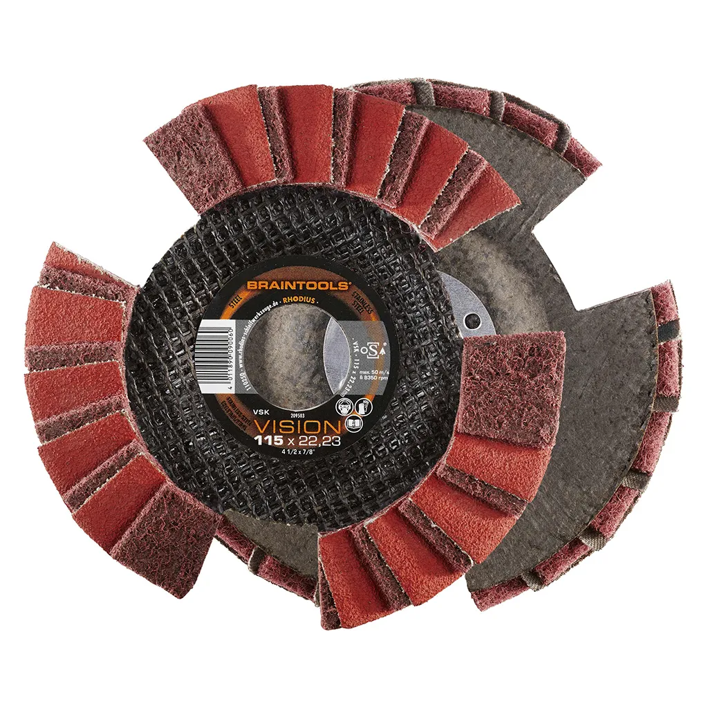 Ce disque a été conçu conformément à la norme EN 13743, satisfait aux exigences de sécurité et est homologué par l’oSA. Il est doté d’un plateau support en fibres de verre. Son utilisateur peut travailler en exerçant de fortes pressions sur sa machine. Le disque à lamelles VSK VISION se caractérise par sa combinaison d’une toile abrasive avec d’un non-tissé. De l’oxyde d’aluminium de qualité est utilisé ici comme grain abrasif. Tous les disques à lamelles RHODIUS ne contiennent en outre ni fer, ni soufre. Les lamelles sont placées de manière conique sur ce disque. Le positionnement conique des lamelles à 10° améliore l’ergonomie pendant le meulage et facilite ainsi la manipulation.