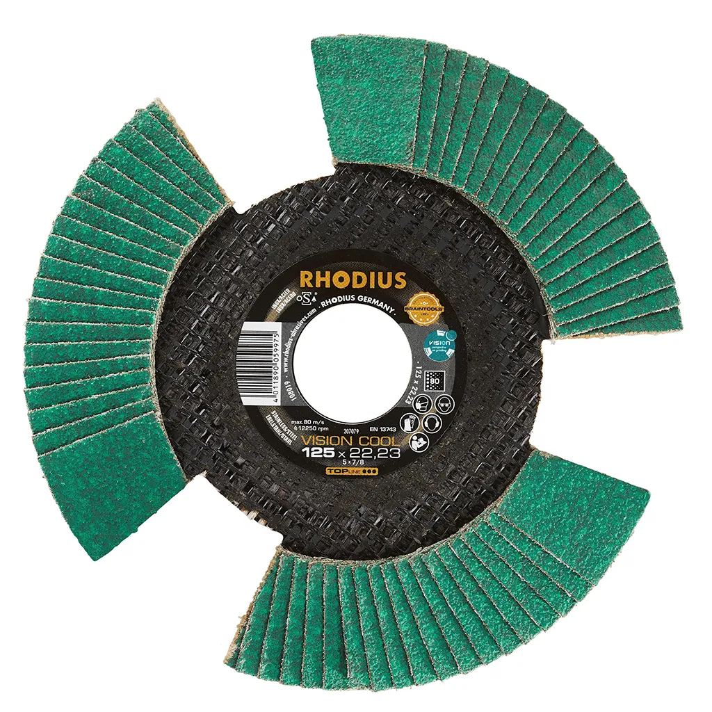 Ce disque a été conçu conformément à la norme EN 13743, satisfait aux exigences de sécurité et est homologué par l’oSA. Il est doté d’un plateau support en fibres de verre. Son utilisateur peut travailler en exerçant de fortes pressions sur sa machine. Le VISION COOL utilise du zirconium de qualité comme grain abrasif. Tous les disques à lamelles RHODIUS ne contiennent en outre ni fer, ni soufre. Les lamelles sont placées de manière conique sur ce disque. Le positionnement conique des lamelles à 10° améliore l’ergonomie pendant le meulage et facilite ainsi la manipulation.