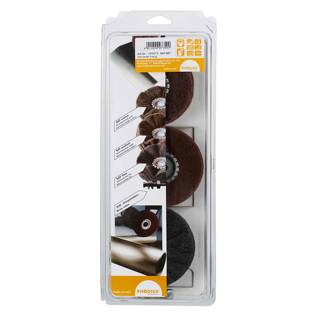 L’anneau à satiner SAT a été spécialement développé pour le traitement de l’acier inoxydable (acier VA, inox), p. ex. 1.4301 (X5CrNi18-10 ou 304), ainsi que de l’acier (acier au carbone, également appelé acier de construction, St37, S235JR, 1.0037 ou acier noir) et de la fonte d’acier, mais aussi de l’aluminium et d’autres métaux non-ferreux, tels que le cuivre, le laiton, le bronze, etc. Avec le SAT de RHODIUS, l’utilisateur obtiendra de très bons résultats sur tous les matériaux indiqués ici.
