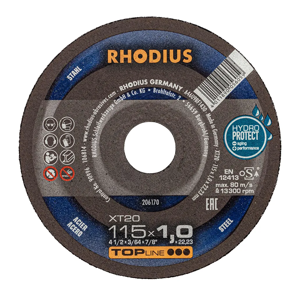 Il s’agit ici d’un disque de forme droite (forme 41). Les disques de tronçonnage de forme droite permettent une profondeur de pénétration supérieure et donc également plus de coupes. Les disques RHODIUS XT20 dans les diamètres de 180 et 230 mm jouissent en outre de la technologie RHODIUS EXTENDED utilisée ici pour leur garantir une durée de vie encore plus longue.