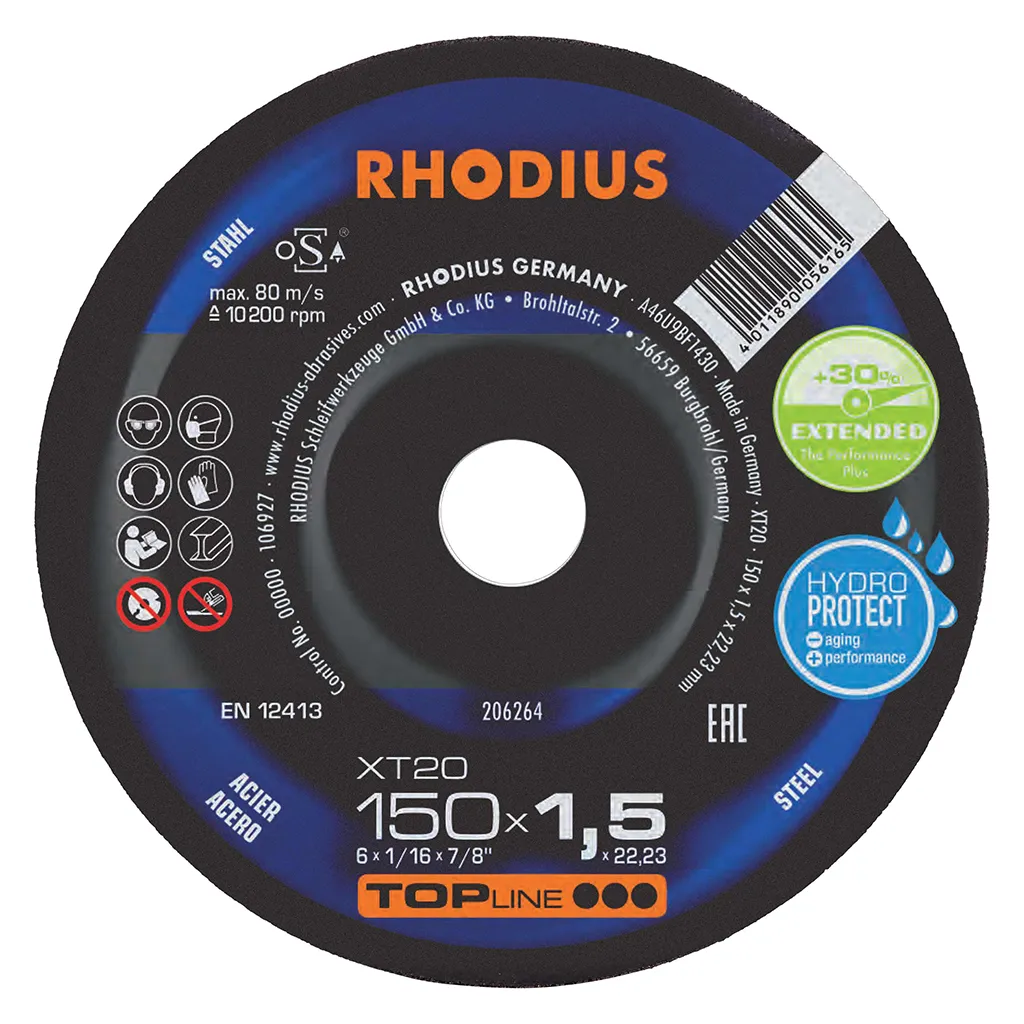 Il s’agit ici d’un disque de forme droite (forme 41). Les disques de tronçonnage de forme droite permettent une profondeur de pénétration supérieure et donc également plus de coupes. Les disques RHODIUS XT20 dans les diamètres de 180 et 230 mm jouissent en outre de la technologie RHODIUS EXTENDED utilisée ici pour leur garantir une durée de vie encore plus longue.