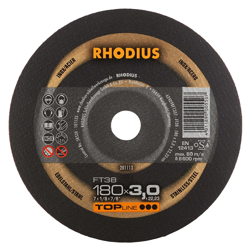 Dans la pratique, le FT38 se caractérise par une très longue durée de vie, des coupes agressives, une formation de poussière réduite et un fonctionnement exceptionnellement silencieux. Ce disque de tronçonnage permet un travail particulièrement rentable. Cet outil de qualité RHODIUS convient tout particulièrement pour le tronçonnage de l’acier de construction, de l’acier à outils, de l’acier antirouille et antiacide, de l’acier fortement allié, des tôles à haute rigidité, ainsi que des supports, profilés, plaques et traverses.