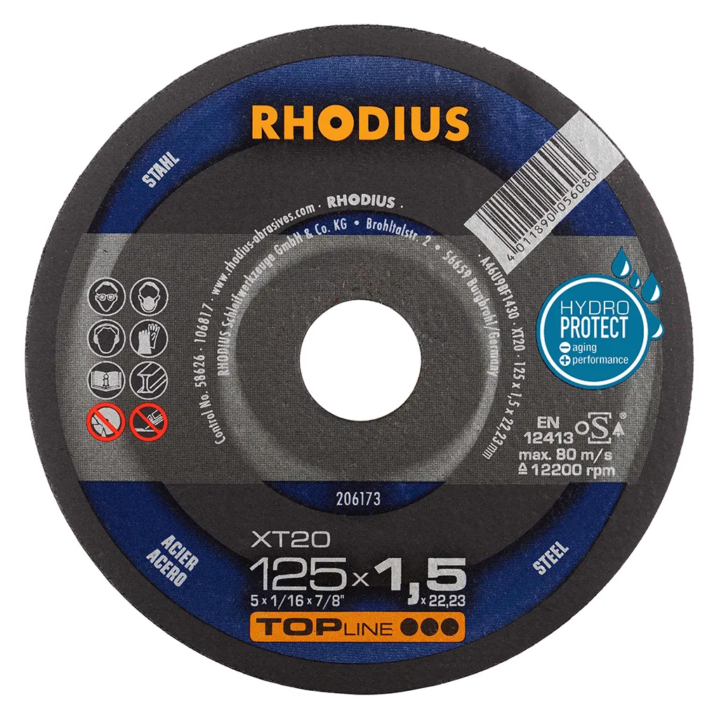 Il s’agit ici d’un disque de forme droite (forme 41). Les disques de tronçonnage de forme droite permettent une profondeur de pénétration supérieure et donc également plus de coupes. Les disques RHODIUS XT20 dans les diamètres de 180 et 230 mm jouissent en outre de la technologie RHODIUS EXTENDED utilisée ici pour leur garantir une durée de vie encore plus longue.