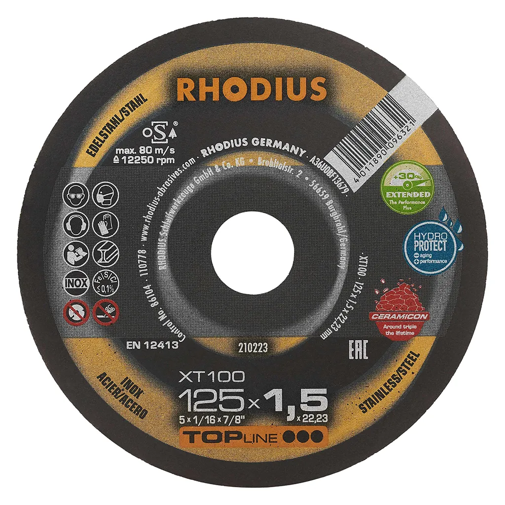 Dans la pratique, le XT100 convainc par une durée de vie très élevée, ainsi que des coupes particulièrement agressives, simples et rapides, même dans les matériaux pleins. Ce disque se caractérise par une projection d’étincelles et Objectif d’utilisation une formation de poussière réduites, une utilisation stable, ainsi que par un fonctionnement exceptionnellement silencieux. Il facilite le travail et est particulièrement rentable. Un travail précis et rapide dans les matériaux à paroi mince ne pose plus aucun problème. Il offre un rapport qualité-prix optimal. Cet outil de qualité RHODIUS convient tout particulièrement pour le tronçonnage de l’acier de construction, de l’acier à outils, de l’acier à ressorts, des tôles à paroi mince, de l’acier antirouille et antiacide, de l’acier fortement allié et des tôles à haute rigidité, ainsi que des chemins de câble, supports, profilés, plaques et traverses.