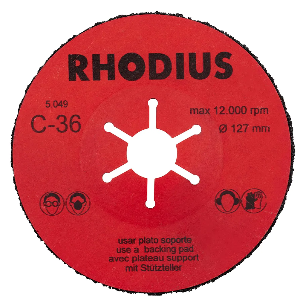 L’utilisation de ce disque fibre n’est autorisée qu’avec un plateau support adéquat, tel que le RHODIUS RH ST. Un plateau support d’un diamètre correspondant doit ici impérativement être choisi.