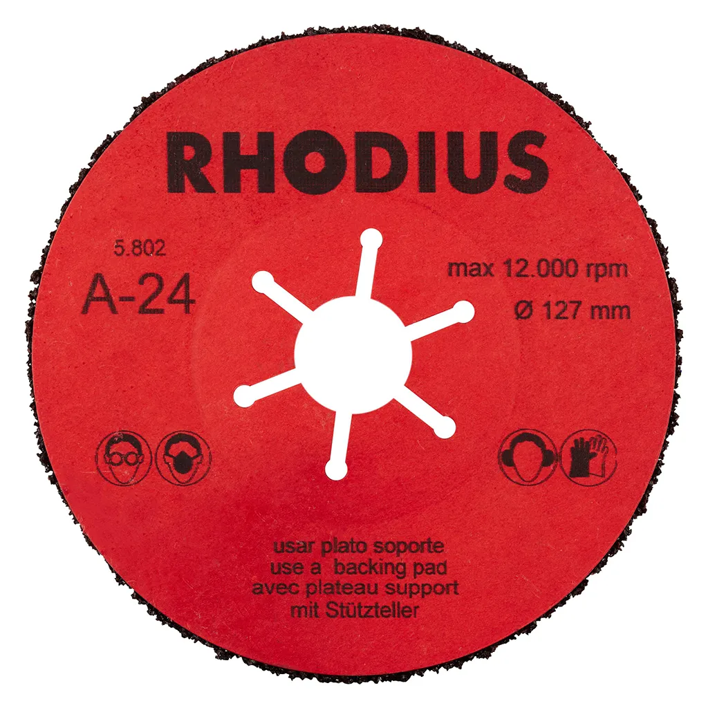L’utilisation de ce disque fibre n’est autorisée qu’avec un plateau support adéquat, tel que le RHODIUS RH ST. Un plateau support d’un diamètre correspondant doit ici impérativement être choisi.