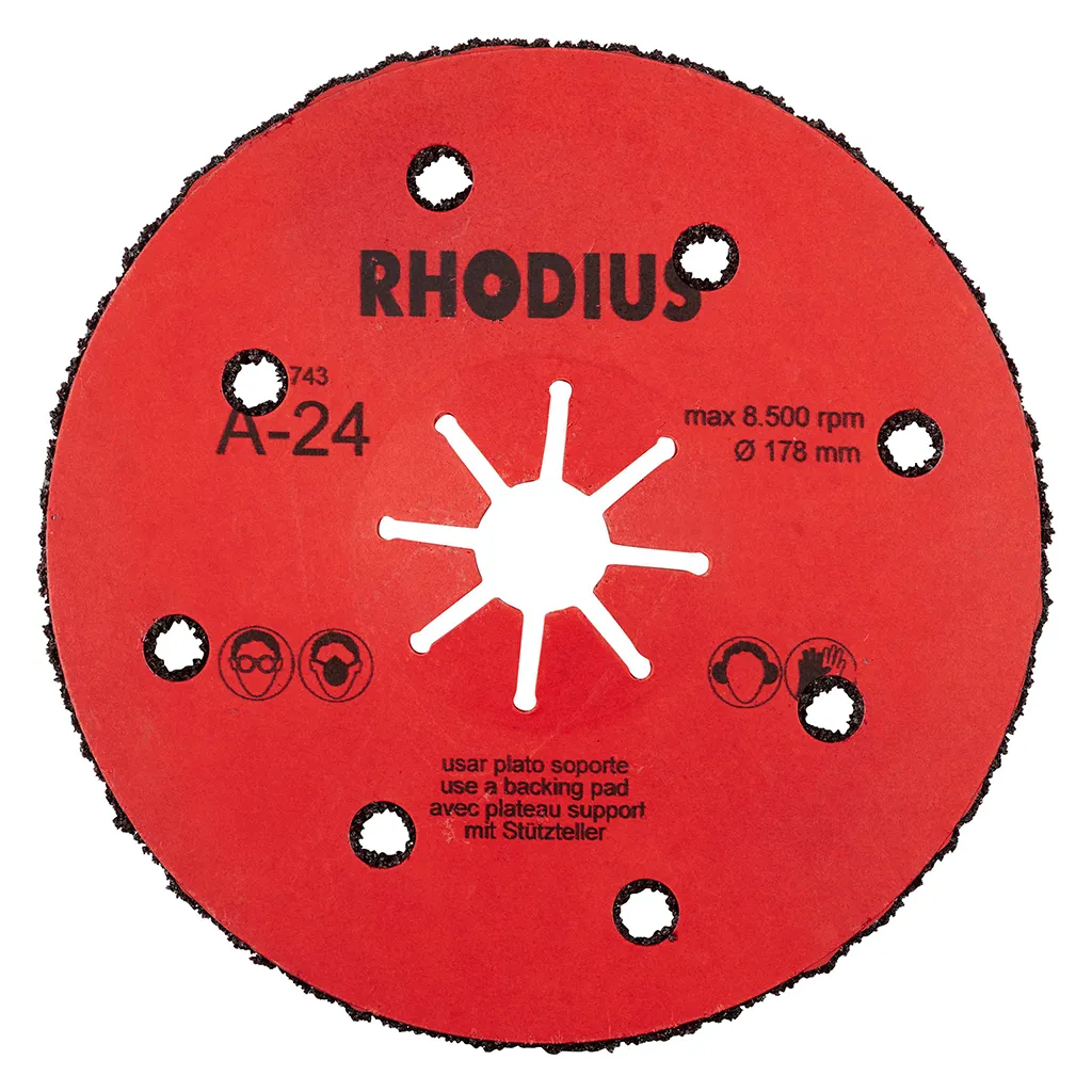 L’utilisation de ce disque fibre n’est autorisée qu’avec un plateau support adéquat, tel que le RHODIUS RH ST. Un plateau support d’un diamètre correspondant doit ici impérativement être choisi.