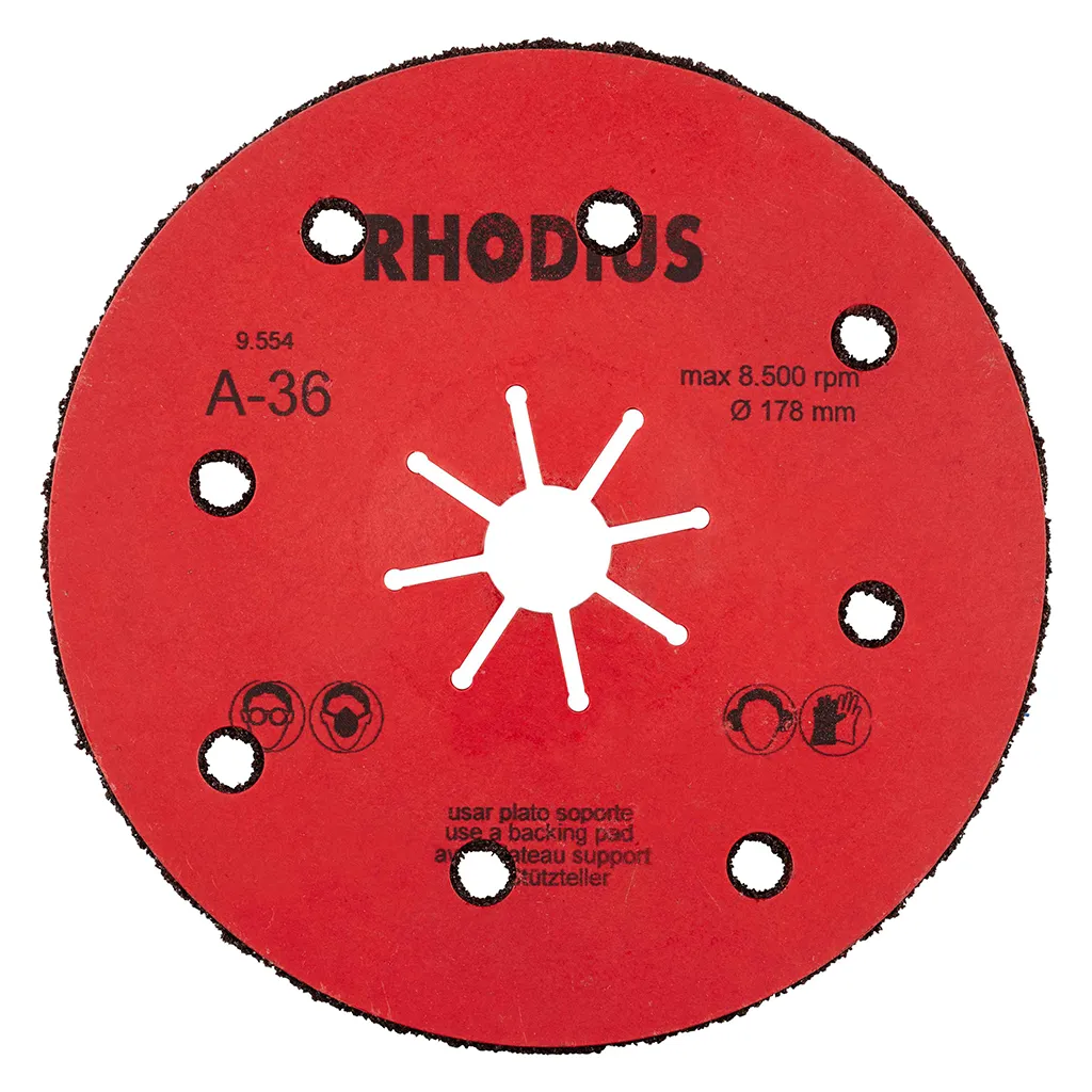 L’utilisation de ce disque fibre n’est autorisée qu’avec un plateau support adéquat, tel que le RHODIUS RH ST. Un plateau support d’un diamètre correspondant doit ici impérativement être choisi.