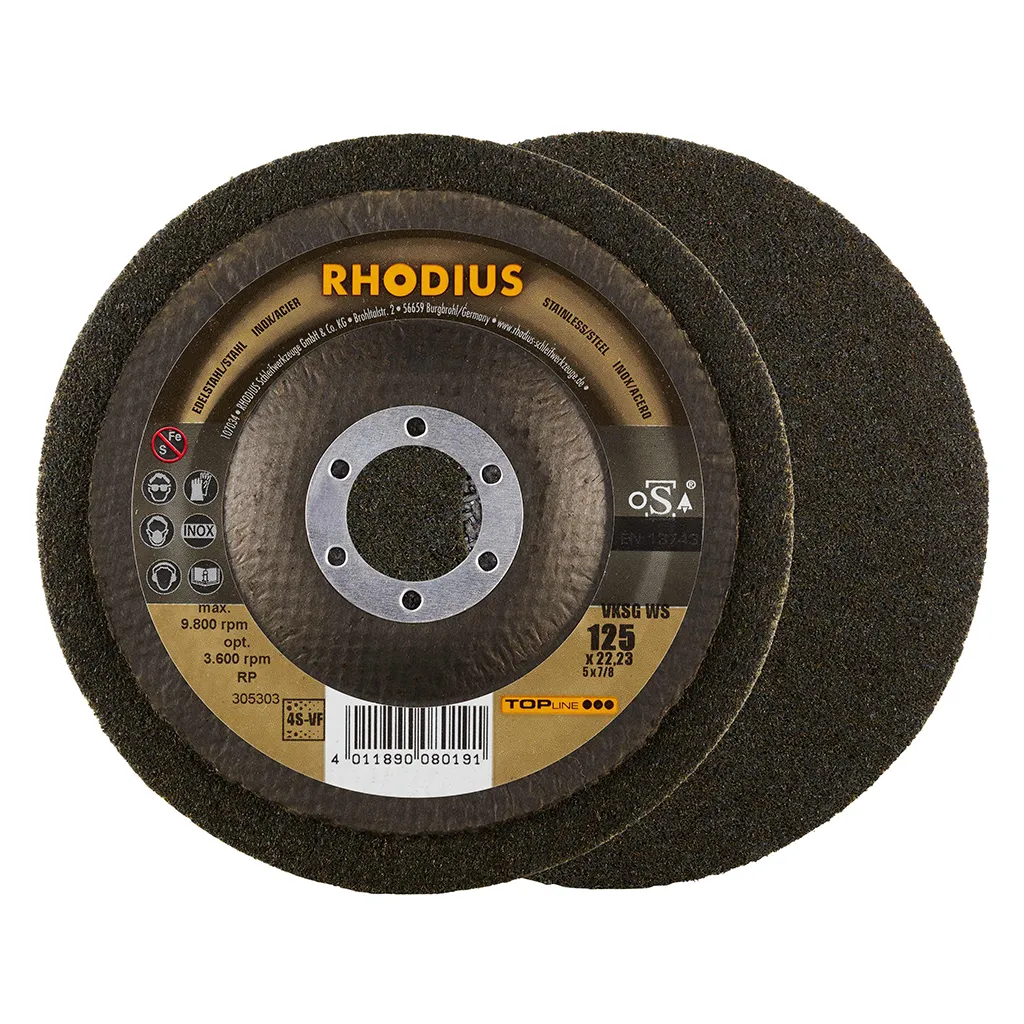 Celui-ci a été spécialement développé pour le traitement de l’acier inoxydable (acier VA, inox), p. ex. 1.4301 (X5CrNi18-10 ou 304), ainsi que de l’acier (acier au carbone, également appelé acier de construction, St37, S235JR, 1.0037 ou acier noir) et de la fonte d’acier, mais aussi de l’aluminium et d’autres métaux non-ferreux, tels que le cuivre, le laiton, le bronze, etc. Avec le VKSG WS de RHODIUS, l’utilisateur obtiendra de très bons résultats sur tous les matériaux indiqués ici.