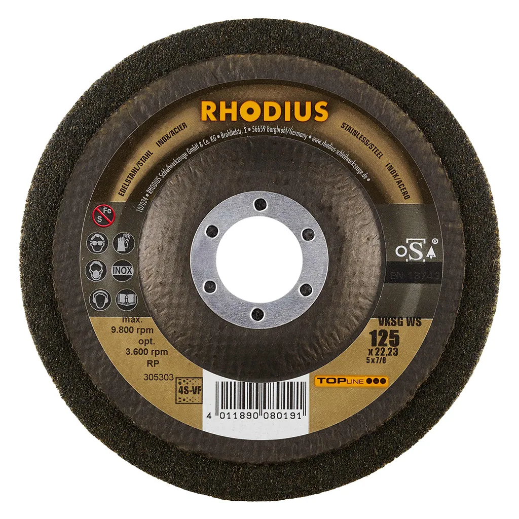 Avec le disque compact en non-tissé VKSG WS (et VKSS WS, modèle incliné), l’utilisateur est assuré d’acquérir le meilleur outil RHODIUS de sa catégorie. Les produits TOPline de RHODIUS sont la garantie de performances et d’une qualité maximales.