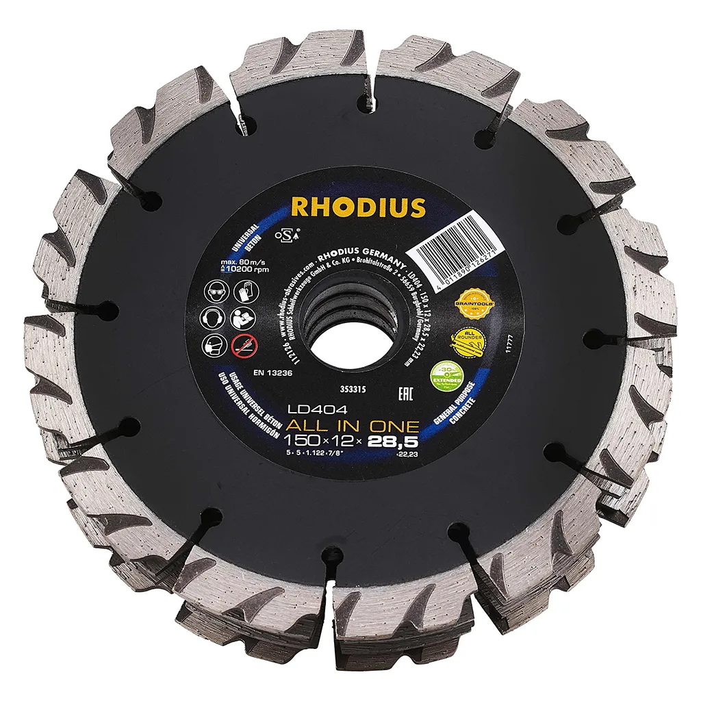 Le LD404 ALL IN ONE est doté d’un bord de coupe segmenté. Il atteint ainsi une vitesse de coupe très élevée avec une durée de vie maximale. Les segments sont en outre disposés de manière croisée. Cet outil a été contrôlé conformément aux normes EN13236 et oSA et peut être utilisé à sec. Grâce à son diamant industriel de qualité et à sa concentration très élevée en diamant, le LD404 ALL IN ONE est particulièrement performant. Ce disque est en outre soudé au laser et fourni entièrement monté.