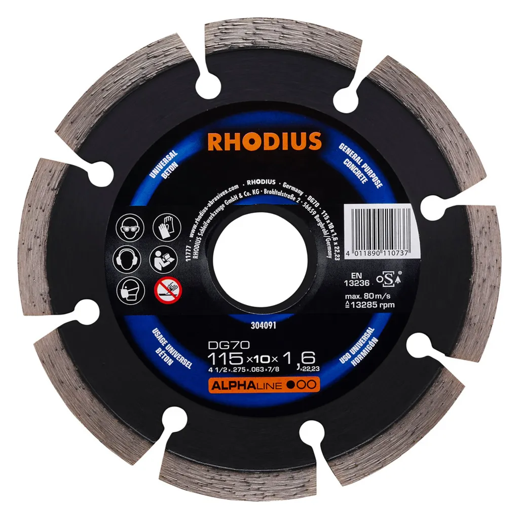 Le DG70 a été développé tout spécialement pour le traitement du béton et des klinkers. Cet outil de qualité RHODIUS convient en outre très bien pour le traitement de la pierre dure et des dalles de ciment, ainsi que des tubes en béton et pierres de bordure.