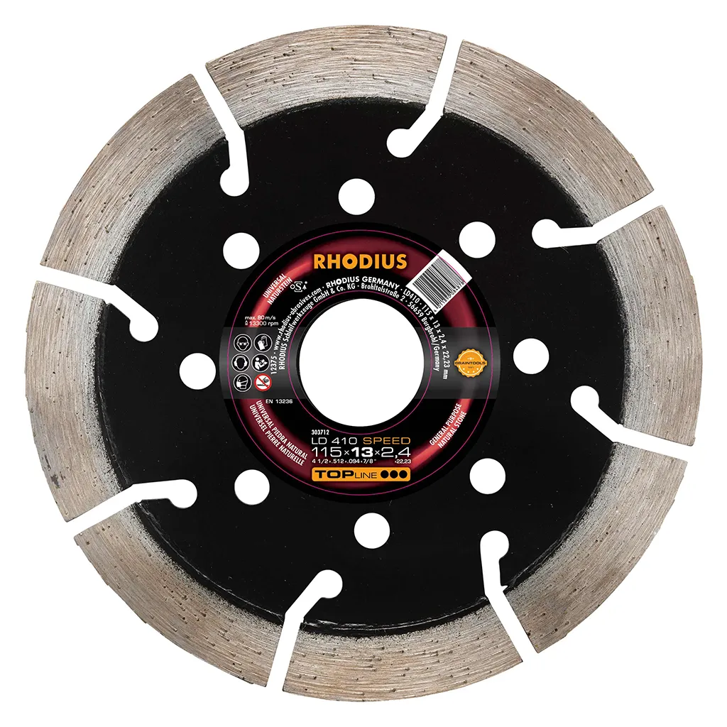 Le LD410 SPEED est doté d’un bord de coupe segmenté. Il atteint ainsi une vitesse de coupe très élevée avec une durée de vie maximale. Cet outil a été contrôlé conformément aux normes EN13236 et oSA et peut être utilisé tant à sec que pour des coupes humides. Grâce à son diamant industriel de qualité et à sa concentration très élevée en diamant, le LD410 SPEED est particulièrement performant. Ce disque à segments forgés est en outre soudé au laser.