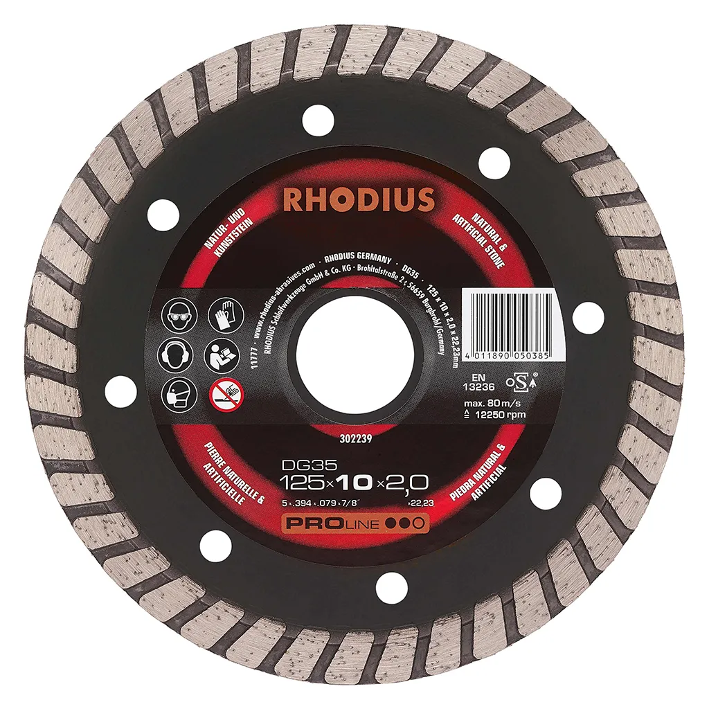 Le DG35 a été développé tout spécialement pour le traitement du granit. Cet outil de qualité RHODIUS convient en outre très bien pour le traitement du béton dur avec des additifs, de tubes en argile, des pavés, des tuiles en argile, du béton et des klinkers, de la pierre dure et des dalles de ciment, des tuiles en béton, ainsi que des blocs creux.