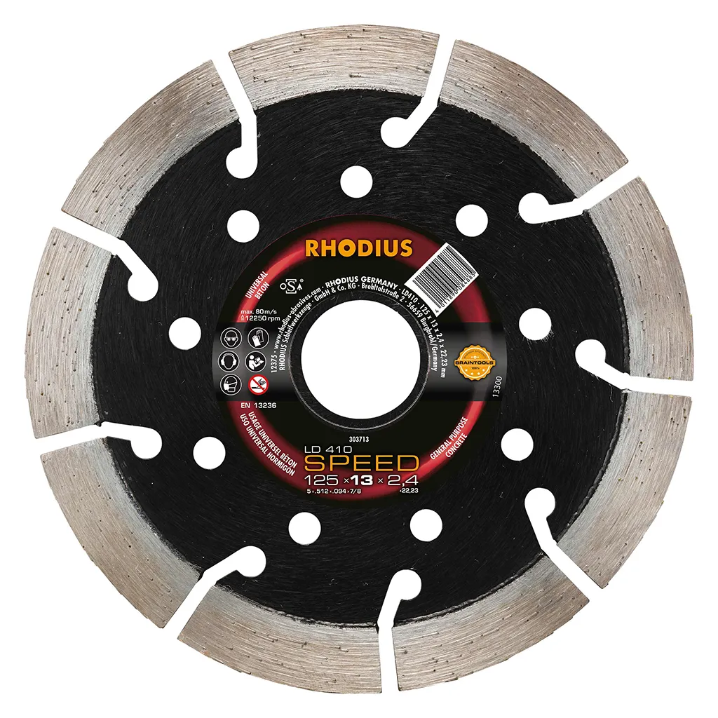 Le LD410 SPEED est doté d’un bord de coupe segmenté. Il atteint ainsi une vitesse de coupe très élevée avec une durée de vie maximale. Cet outil a été contrôlé conformément aux normes EN13236 et oSA et peut être utilisé tant à sec que pour des coupes humides. Grâce à son diamant industriel de qualité et à sa concentration très élevée en diamant, le LD410 SPEED est particulièrement performant. Ce disque à segments forgés est en outre soudé au laser.