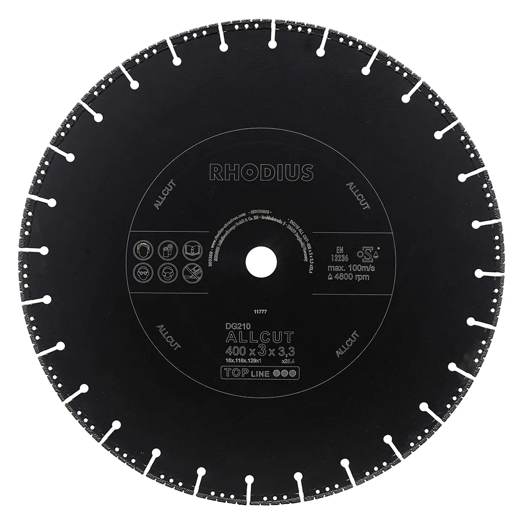 Le DG210 ALLCUT est doté d’un bord de coupe segmenté. Il atteint ainsi une vitesse de coupe très élevée avec une durée de vie maximale. Cet outil a été contrôlé conformément aux normes EN13236 et oSA et peut être utilisé tant à sec que pour des coupes humides. Grâce à son diamant industriel de qualité, le DG210 ALLCUT est particulièrement performant. Ce disque est soudé sous vide.