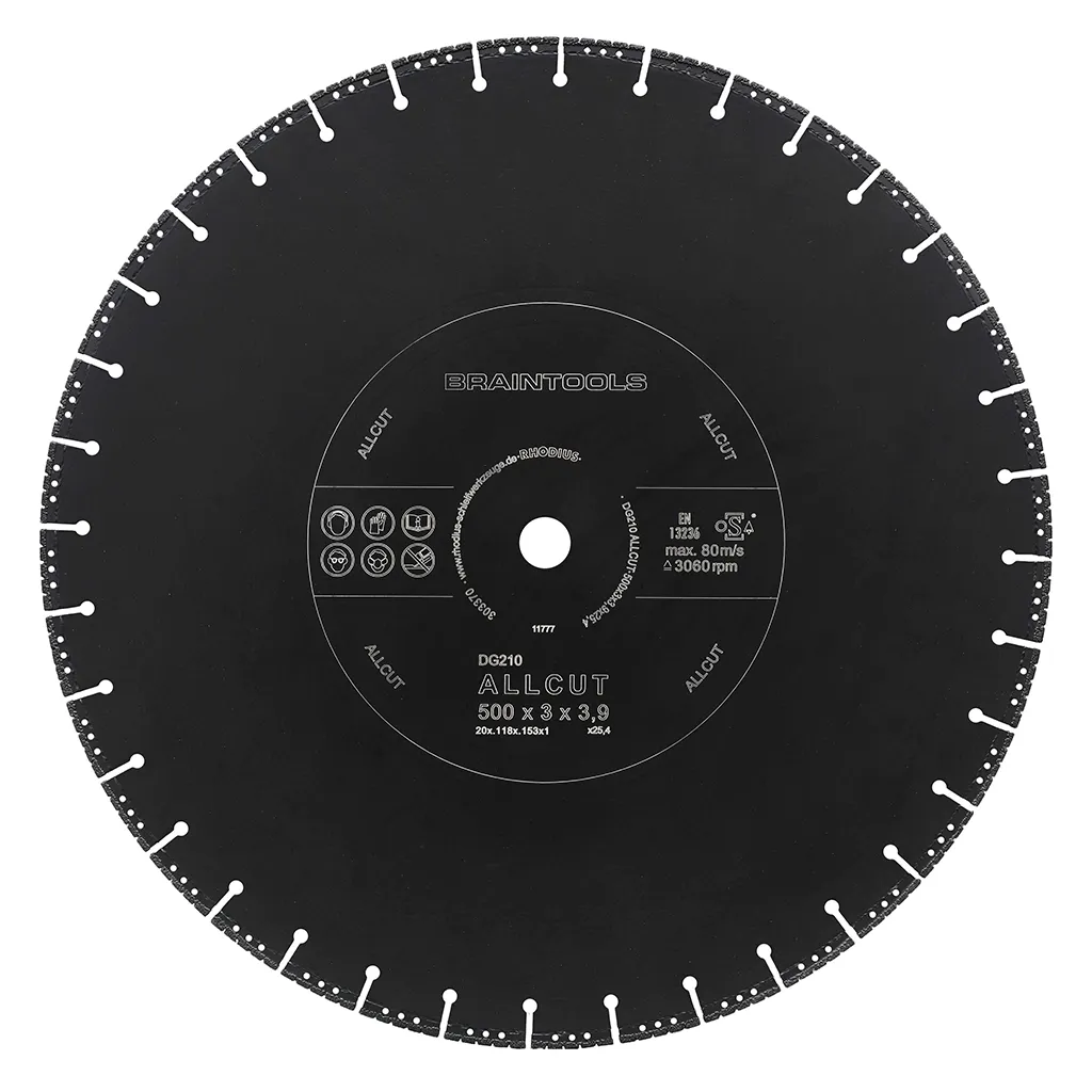 Le DG210 ALLCUT est doté d’un bord de coupe segmenté. Il atteint ainsi une vitesse de coupe très élevée avec une durée de vie maximale. Cet outil a été contrôlé conformément aux normes EN13236 et oSA et peut être utilisé tant à sec que pour des coupes humides. Grâce à son diamant industriel de qualité, le DG210 ALLCUT est particulièrement performant. Ce disque est soudé sous vide.