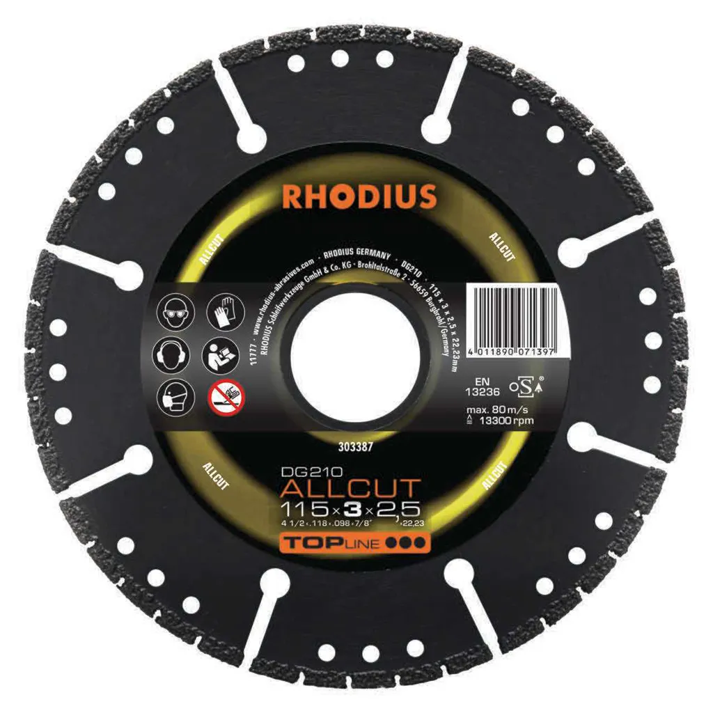 Le DG210 ALLCUT a été développé tout spécialement pour le traitement de l’acier à béton et de l’acier de construction léger. Cet outil de qualité RHODIUS convient en outre très bien pour le traitement du granit, du béton dur avec additifs, du marbre, des pavés, des tuiles en argile, des briques dures, du béton armé, du béton et des klinkers, de la pierre dure et des dalles de ciment, des tubes en béton et pierres de bordure, des briques mi-dures, de l’ardoise, du grès calcaire dur, de la pierre artificielle dure, des blocs de pierre, des tuiles en béton, du grès, des blocs creux et des pierres artificielles tendres.