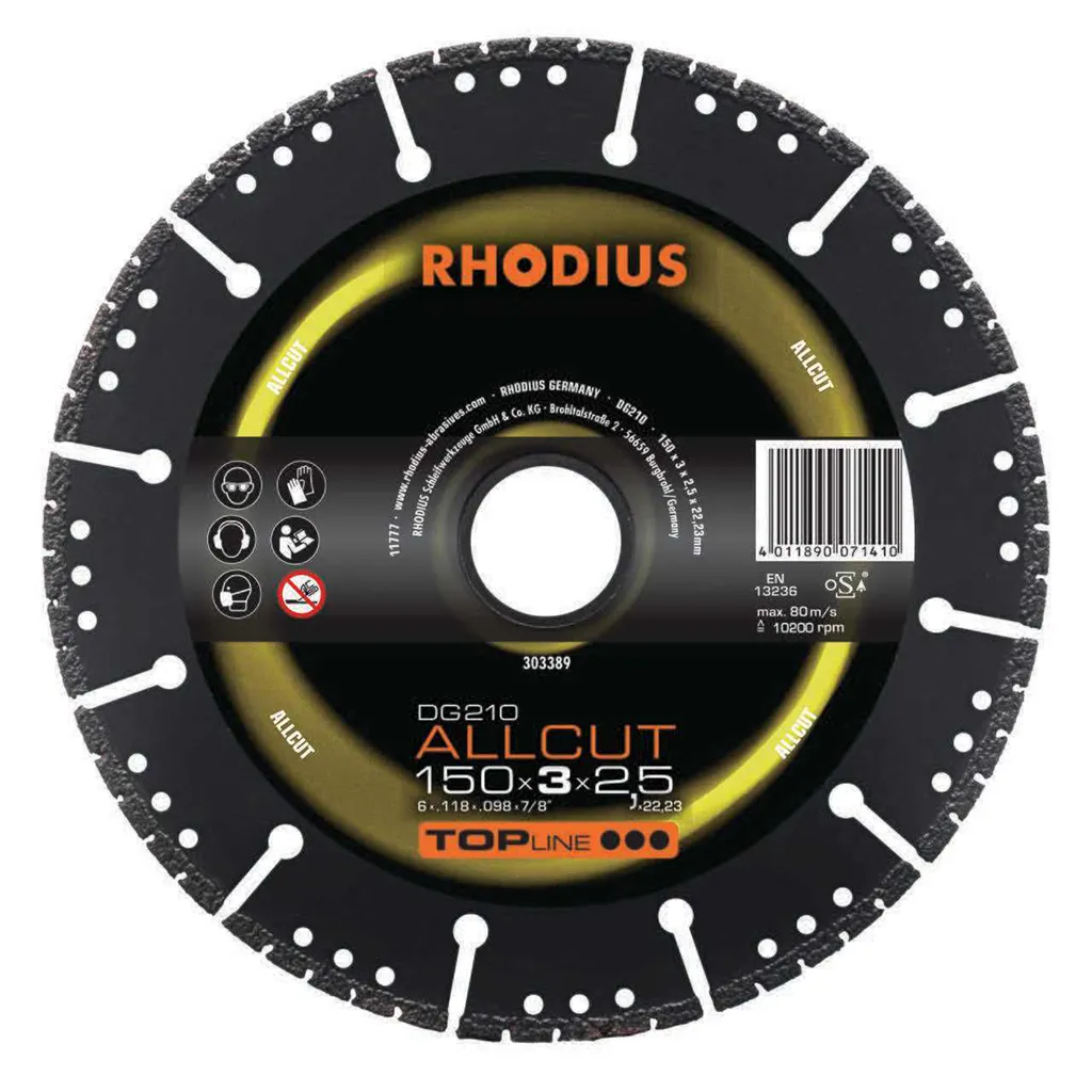 Le DG210 ALLCUT a été développé tout spécialement pour le traitement de l’acier à béton et de l’acier de construction léger. Cet outil de qualité RHODIUS convient en outre très bien pour le traitement du granit, du béton dur avec additifs, du marbre, des pavés, des tuiles en argile, des briques dures, du béton armé, du béton et des klinkers, de la pierre dure et des dalles de ciment, des tubes en béton et pierres de bordure, des briques mi-dures, de l’ardoise, du grès calcaire dur, de la pierre artificielle dure, des blocs de pierre, des tuiles en béton, du grès, des blocs creux et des pierres artificielles tendres.