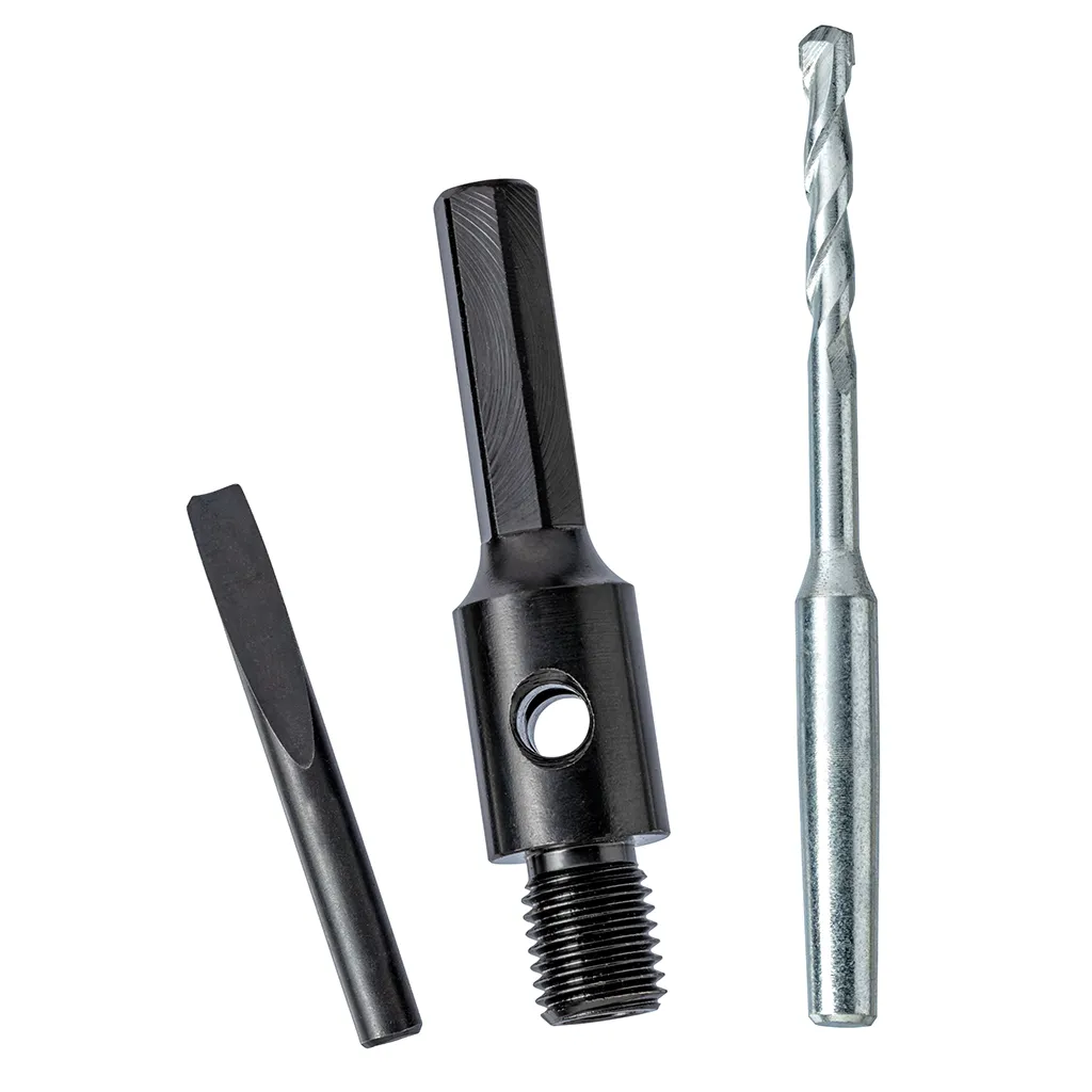 Ce kit se compose de quatre pièces : 1 logement SDS, 1 logement hexagonal, 1 forêt à centrer et 1 gabarit de perçage.