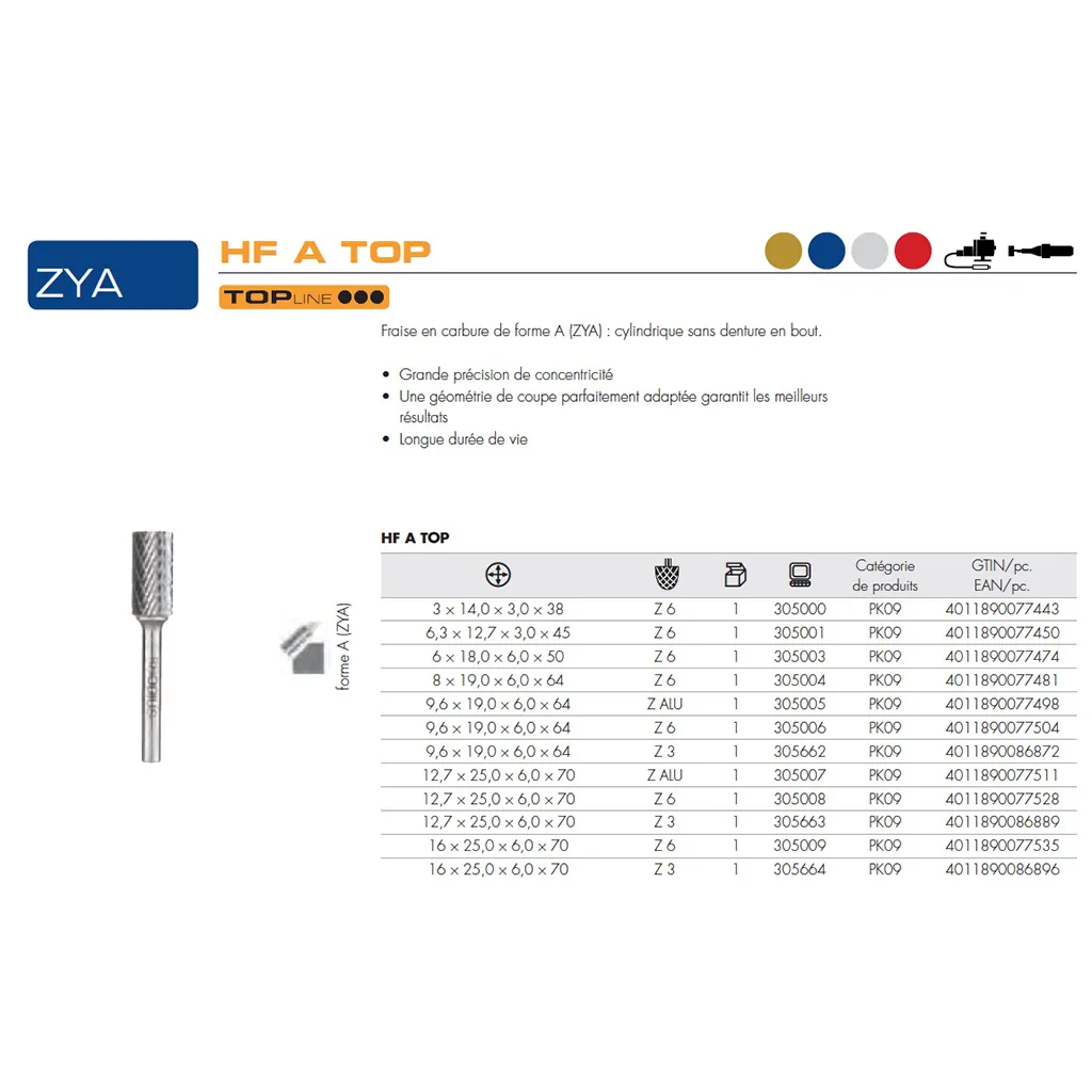Les fraises de forme A (cylindrique sans denture en bout) conformes à la norme DIN 8032 sont disponibles dans des diamètres de tête de 3 à 16 mm. Le diamètre de la tige est de 3 ou 6 mm.