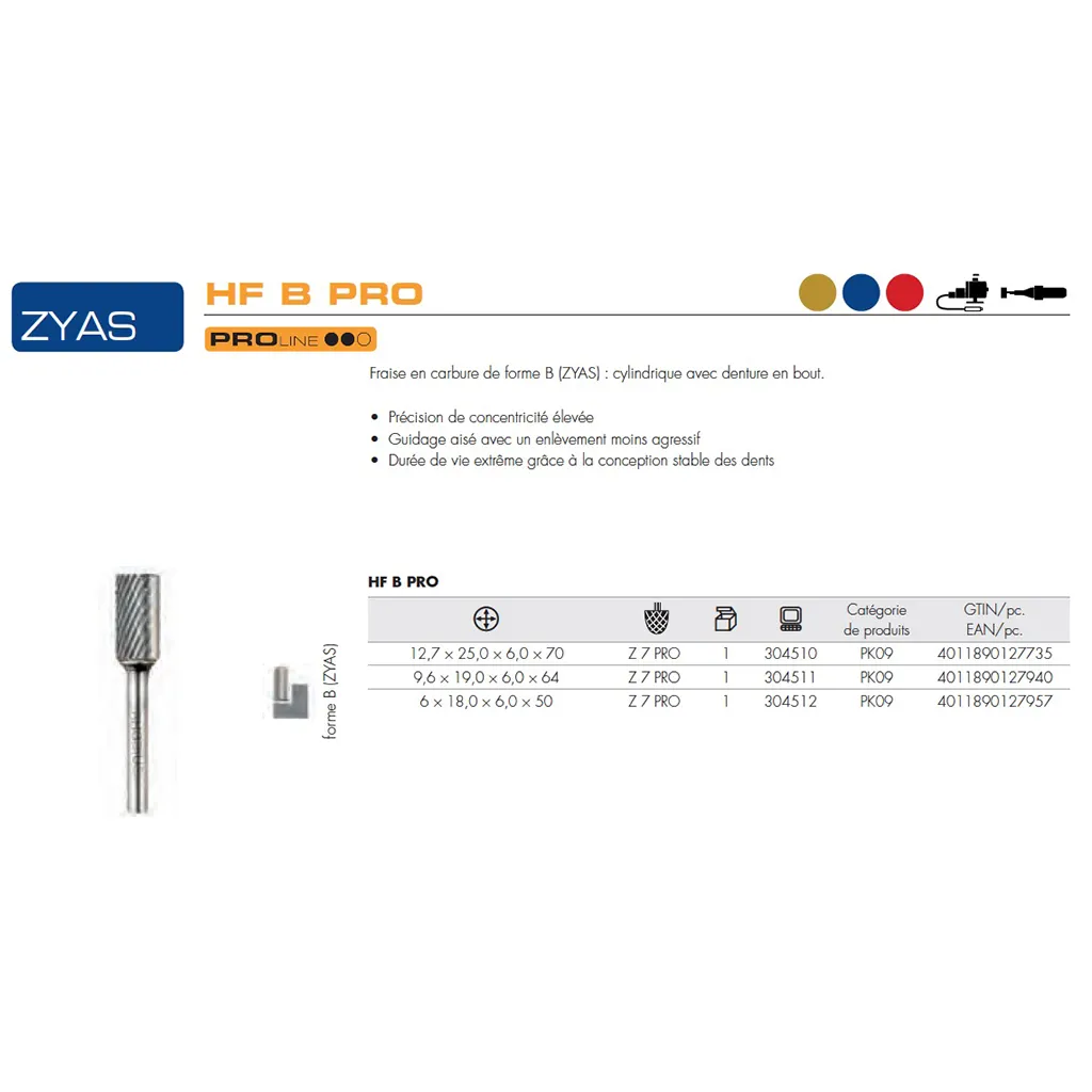 Les fraises de forme B (cylindrique avec denture en bout) conformes à la norme DIN 8032 sont disponibles dans des diamètres de tête de 6 à 12,7 mm. Le diamètre de la tige est de 6 mm.
