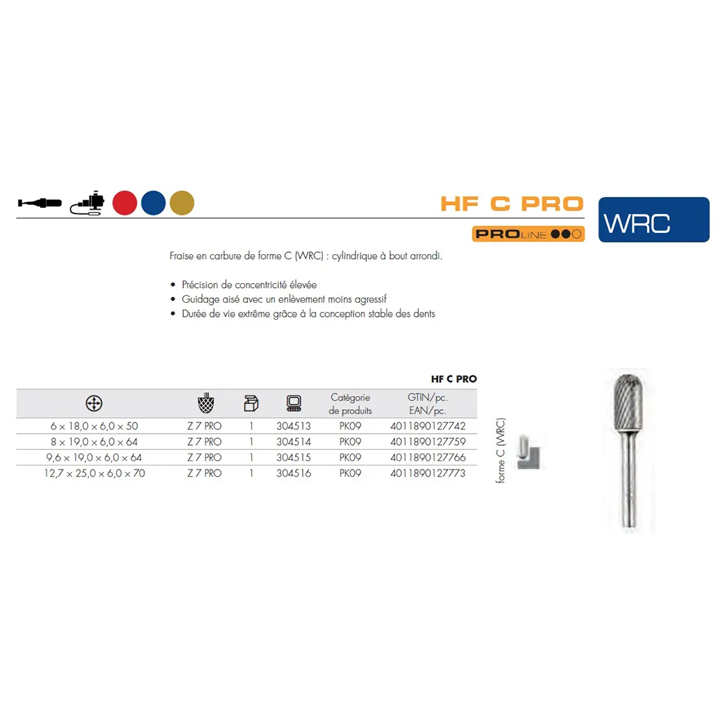 Fraise sur tige Forme C Pro HFC Z7 WRC 6 x 18 x 6 x 50 Cylindrique à bout arrondi. Carbure de forme.