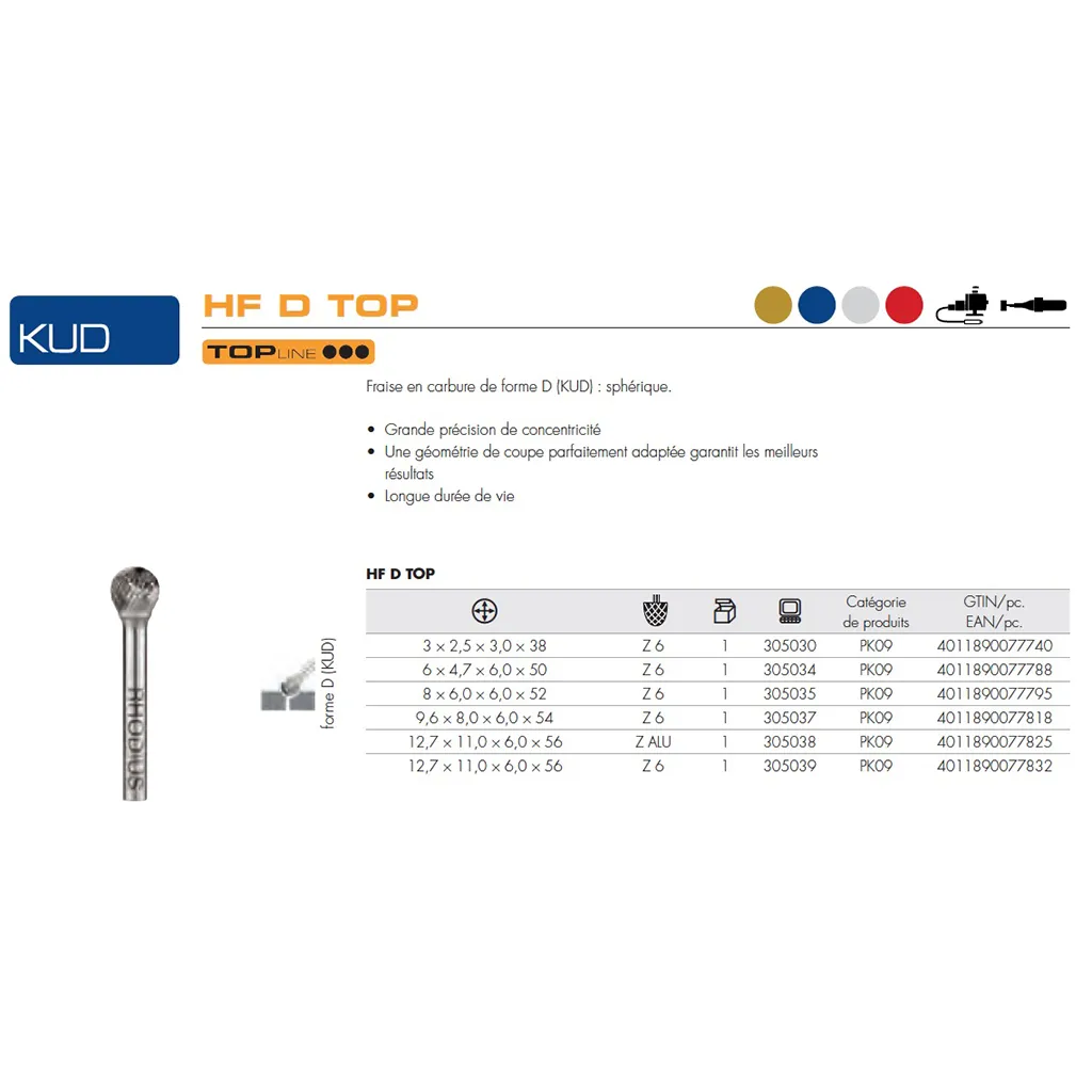 Les fraises de forme D (sphère) conformes à la norme DIN 8032 sont disponibles dans des diamètres de tête de 3 à 12,7 mm. Le diamètre de la tige est de 3 ou 6 mm.