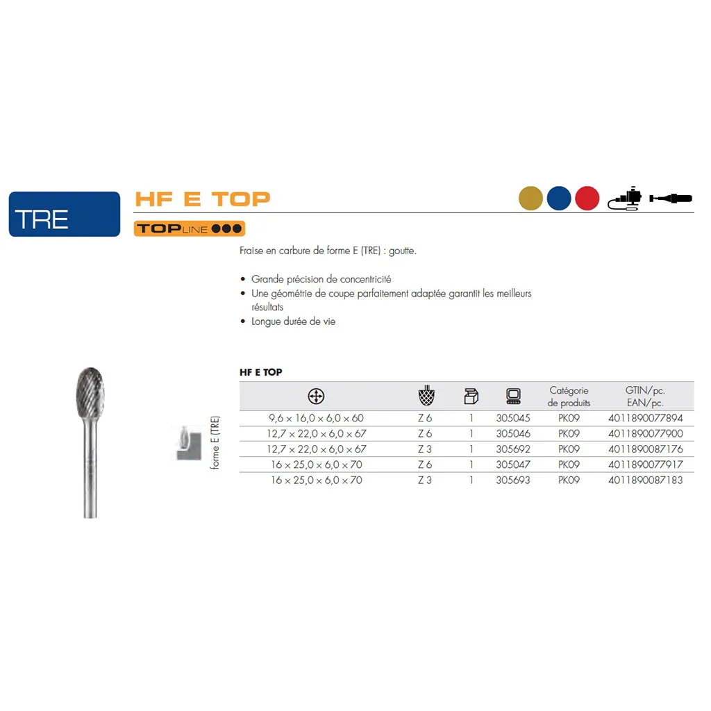 Fraise en carbure de forme E (TRE) : goutte.