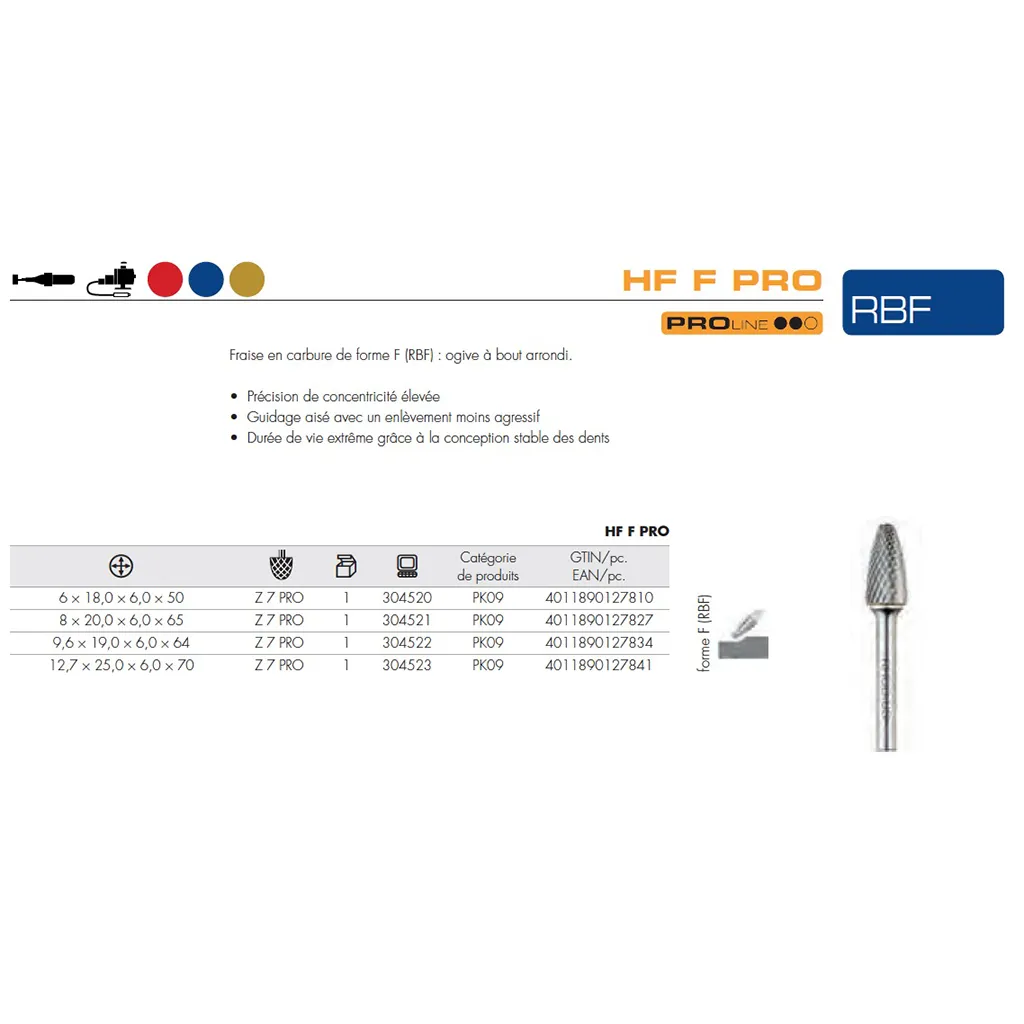 Les fraises de forme F (ogive à bout arrondi) conformes à la norme DIN 8032 sont disponibles dans des diamètres de tête de 6 à 12,7 mm. Le diamètre de la tige est de 6 mm.