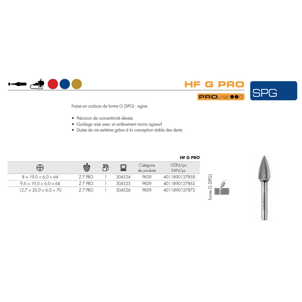 Fraise sur tige Forme G Pro HFG Z7 SPG 8x19x6x64 Ogive. Carbure de forme