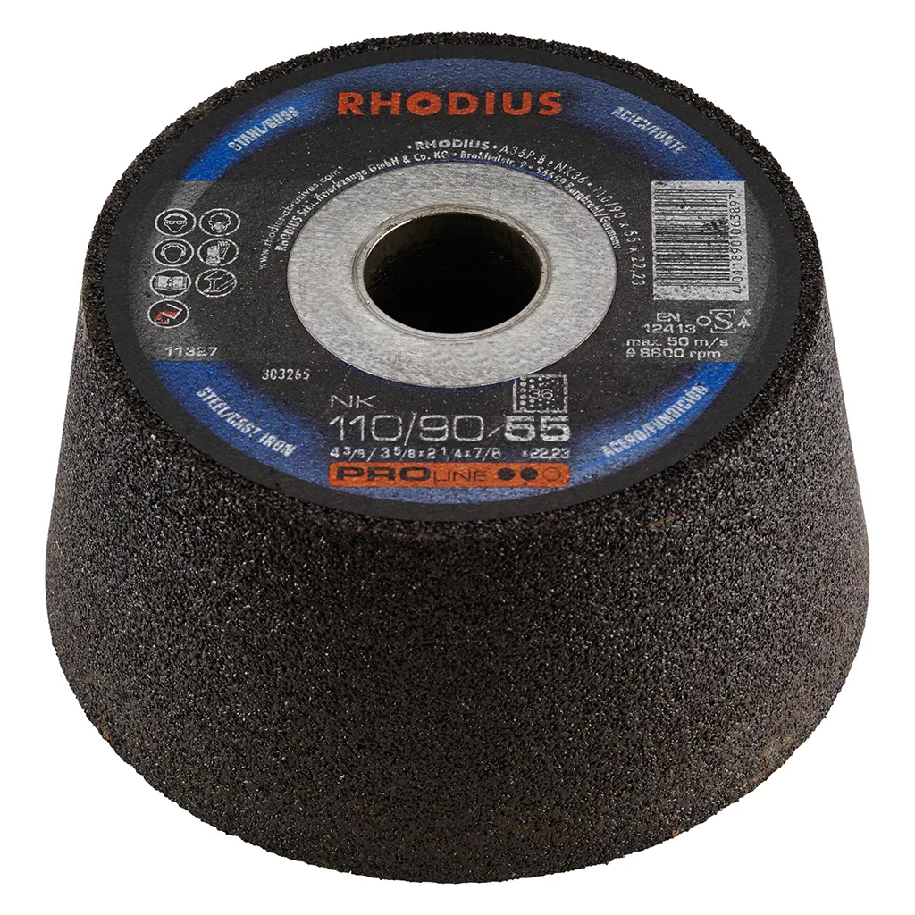 Le RHODIUS NK est un plateau de surfaçage (forme 11) pour les meuleuses d’angle. La meule boisseau ne peut être utilisée qu’avec un capot de protection spécial adéquat.