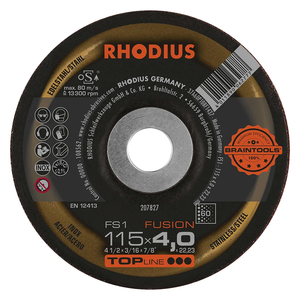 La RHODIUS FS1 FUSION a été spécialement conçue pour le traitement de l’acier inoxydable (acier VA, inox), tel que le 1.4301 (X5CrNi18-10 ou 304), de l’acier (acier au carbone, également appelé acier de construction, St37, S235JR, 1.0037 ou acier noir) et de la fonte d’acier. La meule à ébarber FS1 FUSION convient parfaitement pour le meulage des cordons de soudure.