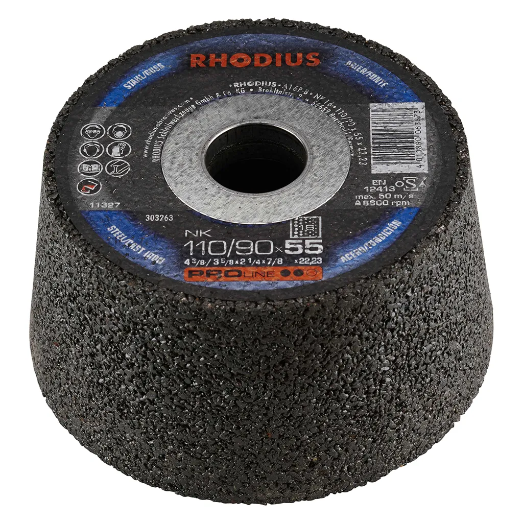 Le RHODIUS NK est un plateau de surfaçage (forme 11) pour les meuleuses d’angle. La meule boisseau ne peut être utilisée qu’avec un capot de protection spécial adéquat.