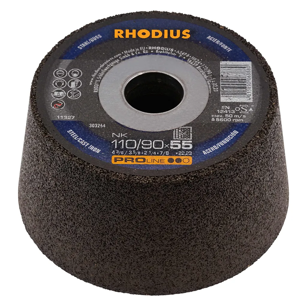 Le RHODIUS NK est un plateau de surfaçage (forme 11) pour les meuleuses d’angle. La meule boisseau ne peut être utilisée qu’avec un capot de protection spécial adéquat.