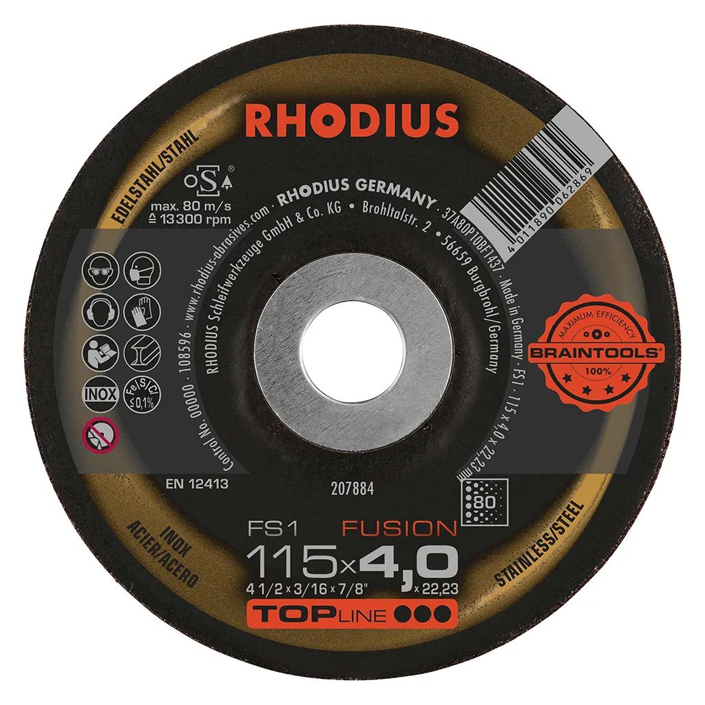 La RHODIUS FS1 FUSION a été spécialement conçue pour le traitement de l’acier inoxydable (acier VA, inox), tel que le 1.4301 (X5CrNi18-10 ou 304), de l’acier (acier au carbone, également appelé acier de construction, St37, S235JR, 1.0037 ou acier noir) et de la fonte d’acier. La meule à ébarber FS1 FUSION convient parfaitement pour le meulage des cordons de soudure.