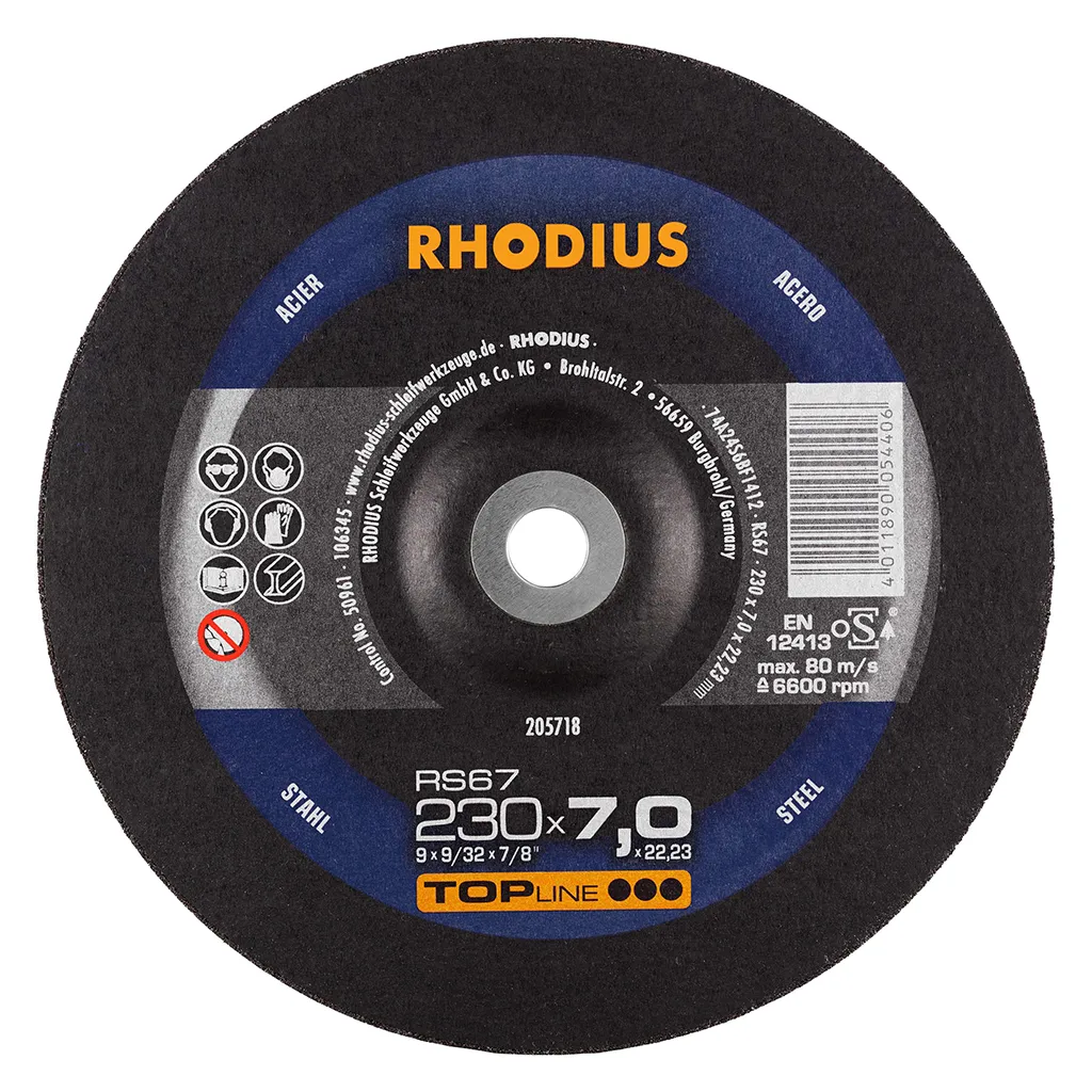 La RHODIUS RS67 a été développée tout spécialement pour le traitement de l’acier (acier au carbone, également appelé acier de construction, St37, S235JR, 1.0037 ou acier noir) et de la fonte d’acier. La meule à ébarber RS67 convient parfaitement pour le chanfreinage, la préparation et l’égalisation des cordons de soudure, ainsi que pour l’ébavurage.