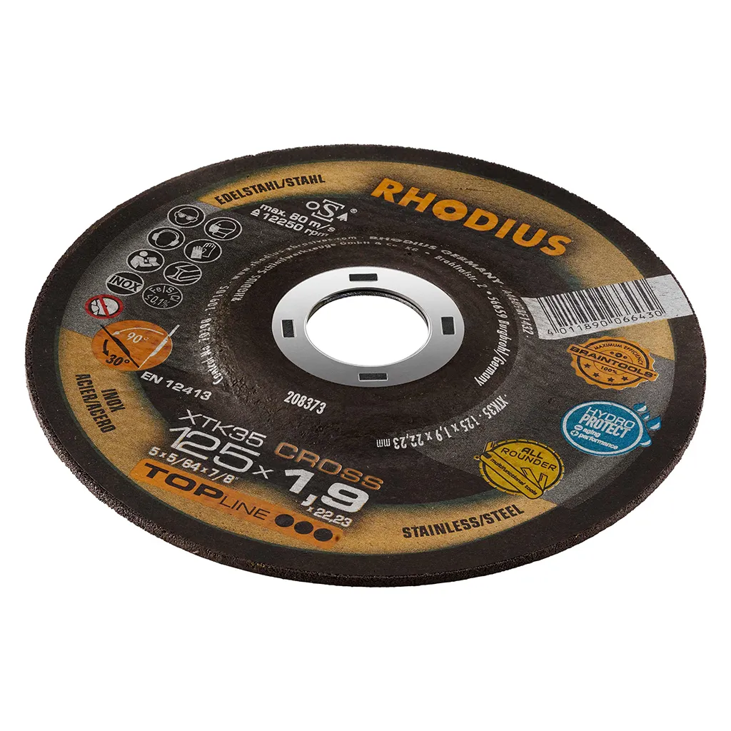 Ce disque est homologué pour le tronçonnage et le meulage. Dans la pratique, le XTK35 CROSS convainc par ses coupes particulièrement agressives, même dans les matériaux pleins. Ce disque se caractérise par son fonctionnement exceptionnellement silencieux. Il offre également une qualité de meulage fine. Il facilite le travail et est particulièrement rentable. Le XTK35 CROSS offre un rapport qualité-prix optimal. Cet outil de qualité RHODIUS convient tout particulièrement pour le tronçonnage et le meulage d’acier de construction, d’acier antirouille et antiacide, d’acier fortement allié, de tôles à haute rigidité, de supports, de profilés et de plaques.