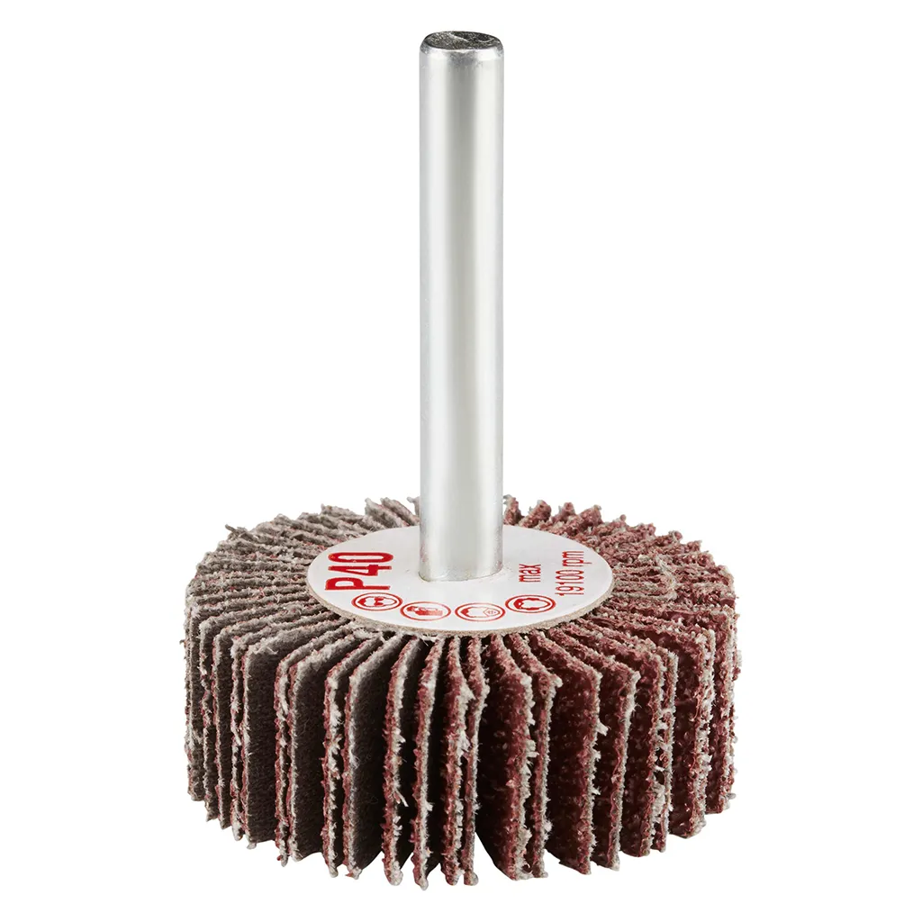 La roue à lamelles FS de RHODIUS a été conçue pour être utilisée sur les meuleuses droites ou les machines à entraînement d’arbre flexible avec logement de tige de 6 mm.