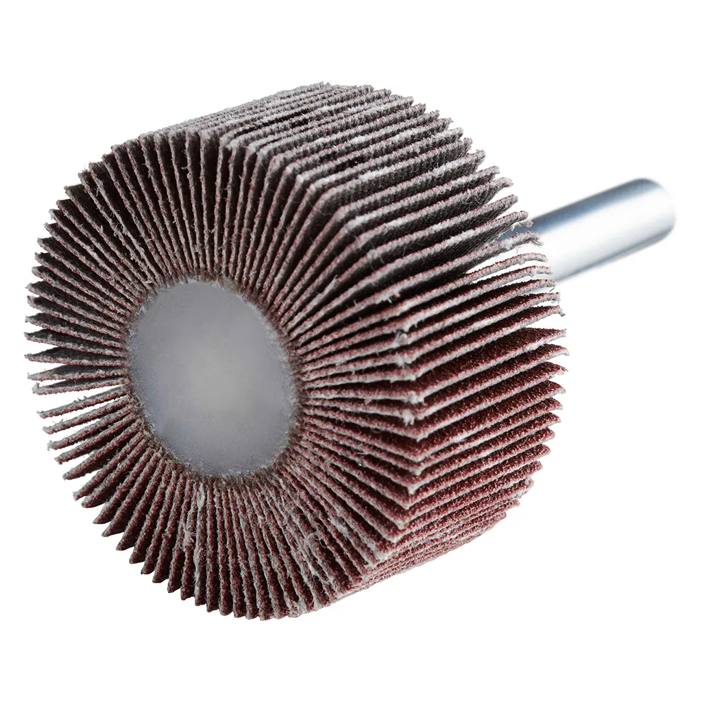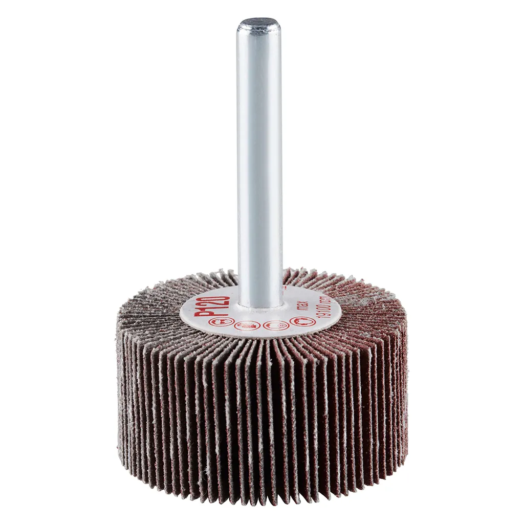 La roue à lamelles FS de RHODIUS a été conçue pour être utilisée sur les meuleuses droites ou les machines à entraînement d’arbre flexible avec logement de tige de 6 mm.