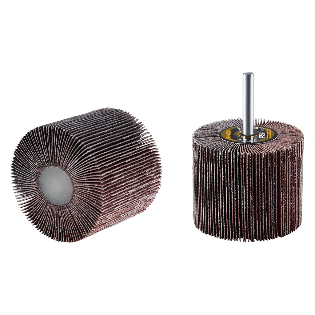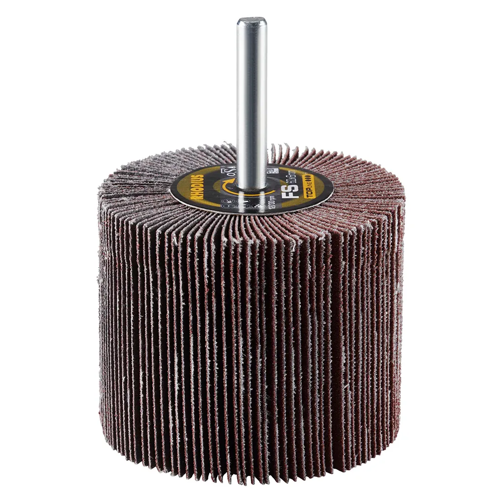 La roue à lamelles FS de RHODIUS a été conçue pour être utilisée sur les meuleuses droites ou les machines à entraînement d’arbre flexible avec logement de tige de 6 mm.